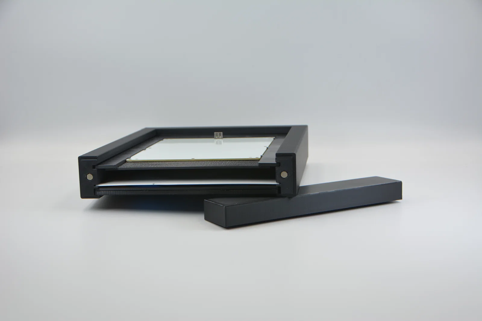 Khung trước và khung sau đều được in bằng Basic PETG Black. Tất cả những phần còn lại đều được in bằng Basic PLA. Hộp (box), nắp (lid) và led panel hoặc led strip holder được in màu đen, còn diffuser được in màu trắng.