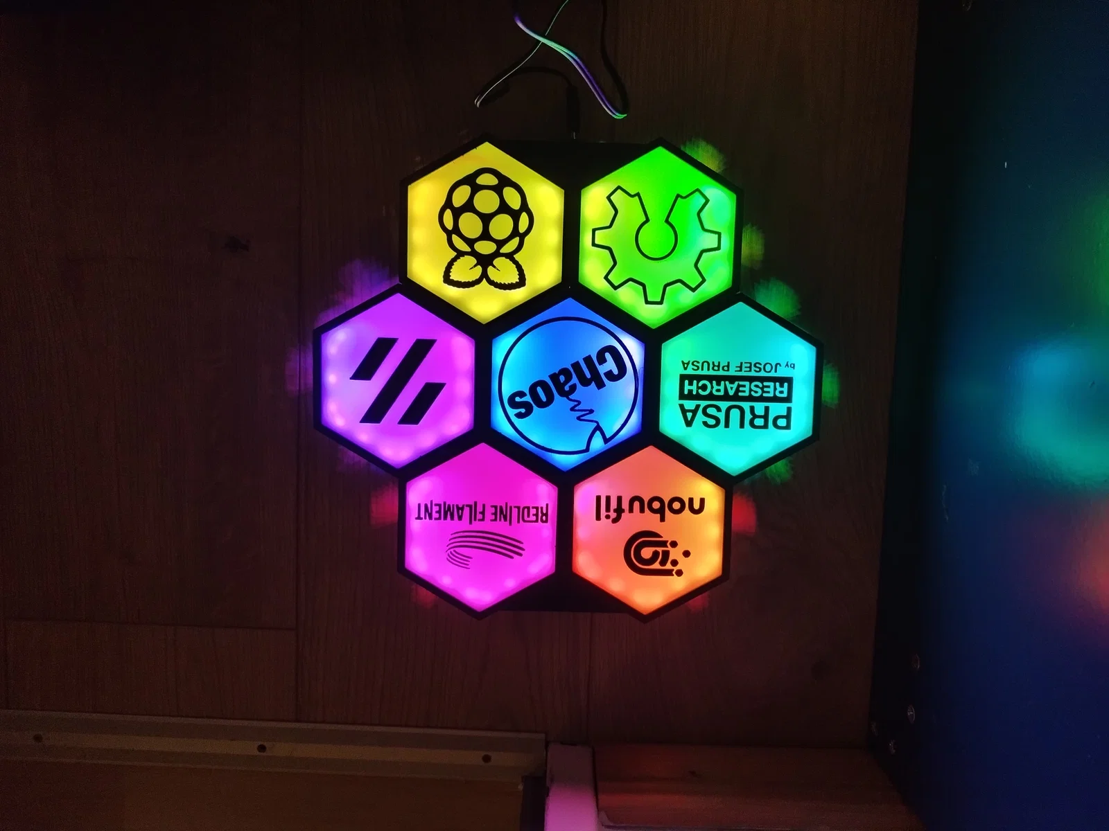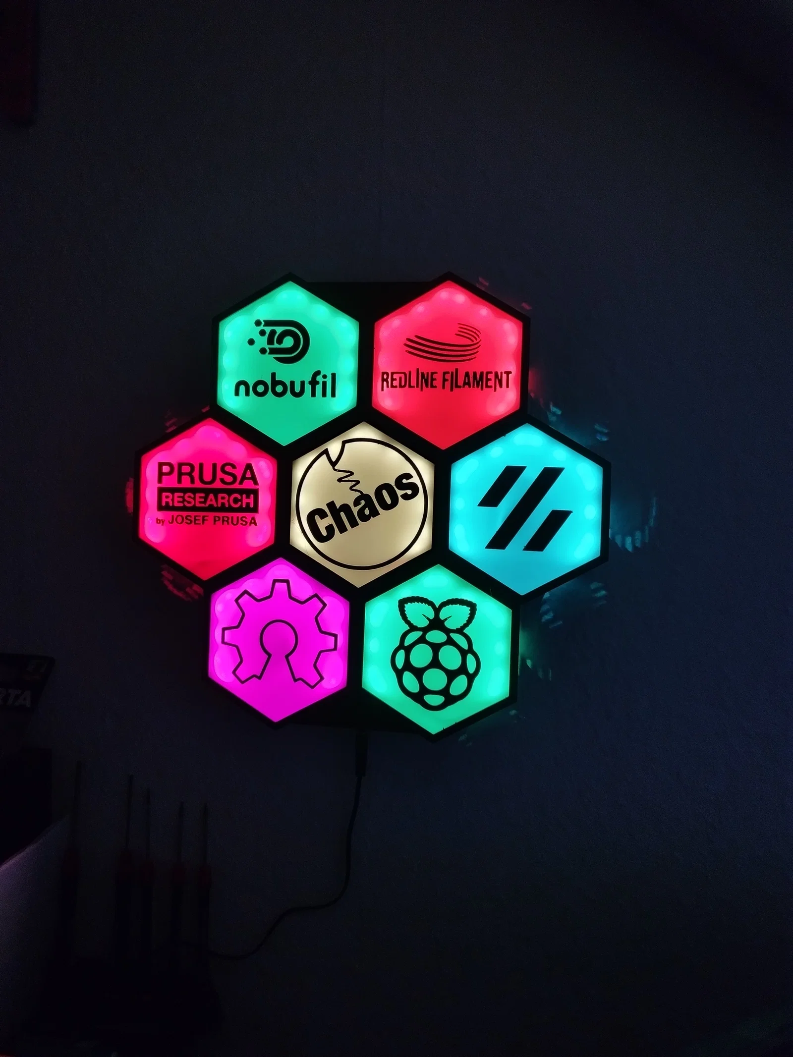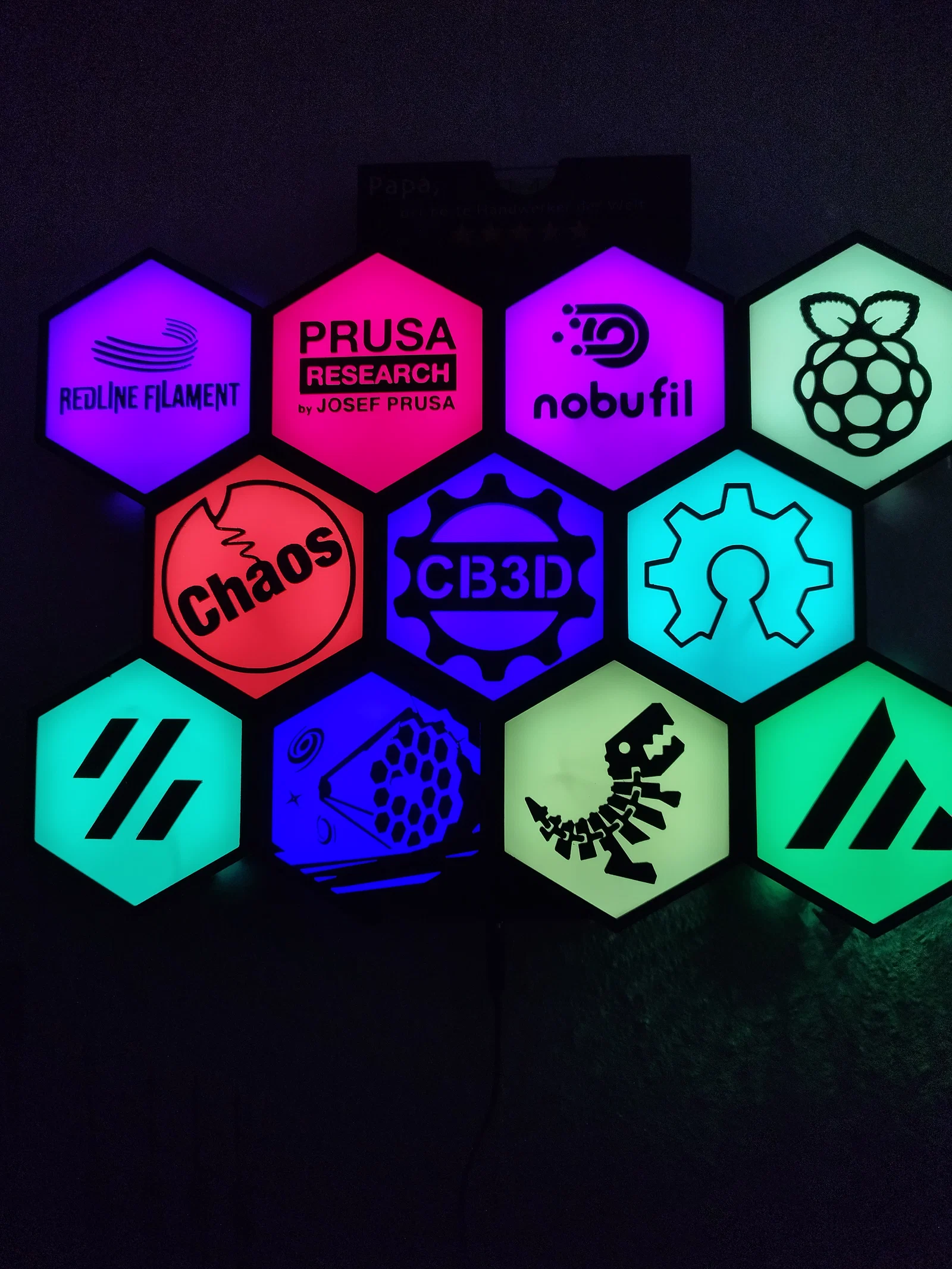 Bộ Logo-Tiles/Logo-Plate cho Hexawall (tường lục giác gắn đèn LED), gồm nhiều logo như Voron, Raspberry Pi, WLED… Có kèm part gốc và vài part nhỏ chỉnh sửa để đi dây nguồn, treo/vít hoặc dán tường.