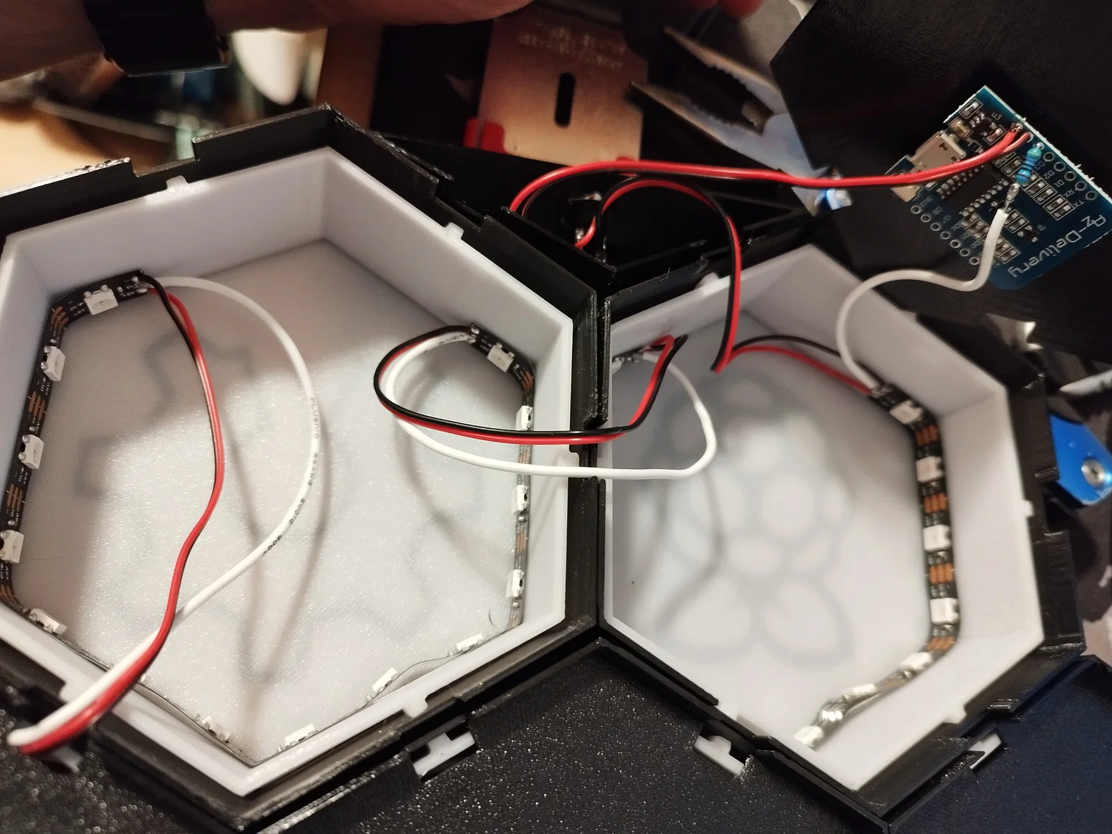 Để chiếu sáng mình dùng 14 LED ws2812b (18 cái cũng có thể vừa, tùy mật độ led/meter của dải LED), một wemos D1 mini và app WLED rất hay https://kno.wled.ge/