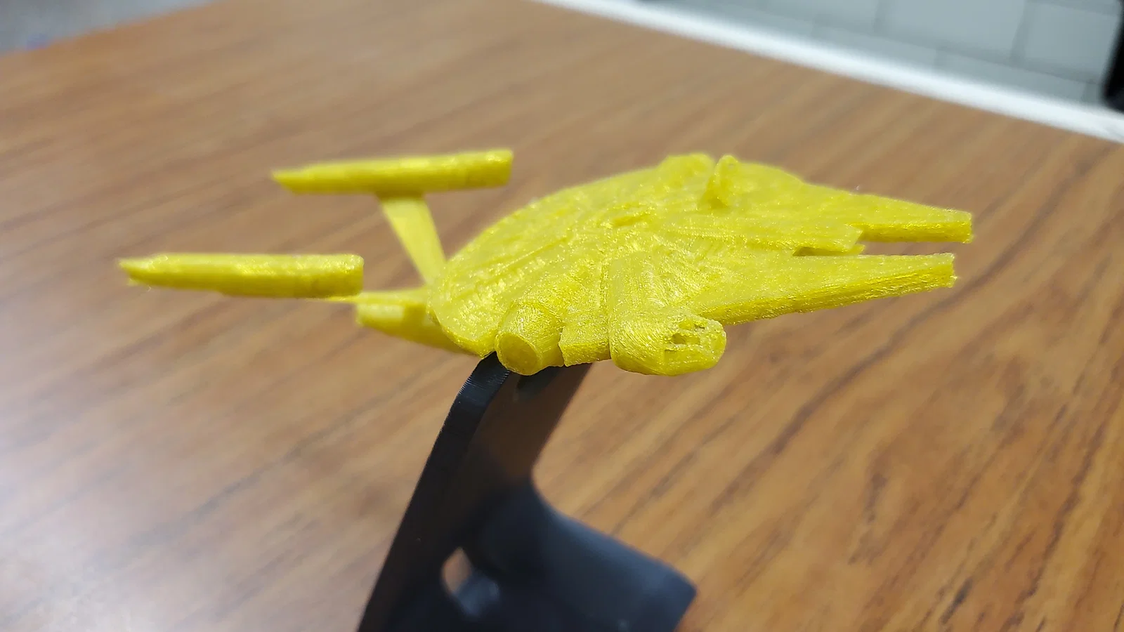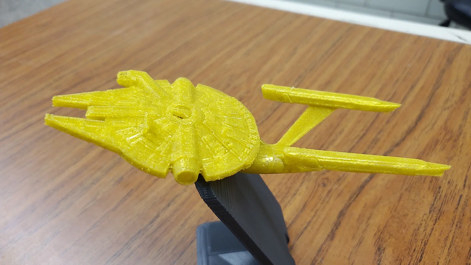 Bản mashup vui giữa 2 model từ Thingiverse, pha trộn chất Star Trek và Star Wars để tạo ra NCC1701-Falcon. Khuyến nghị in nghiêng, đuôi chúc xuống và cần rất nhiều supports để ra form đẹp.