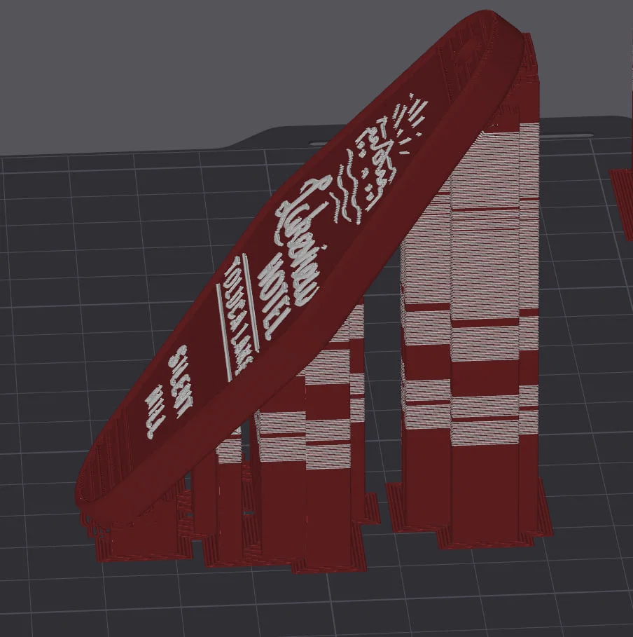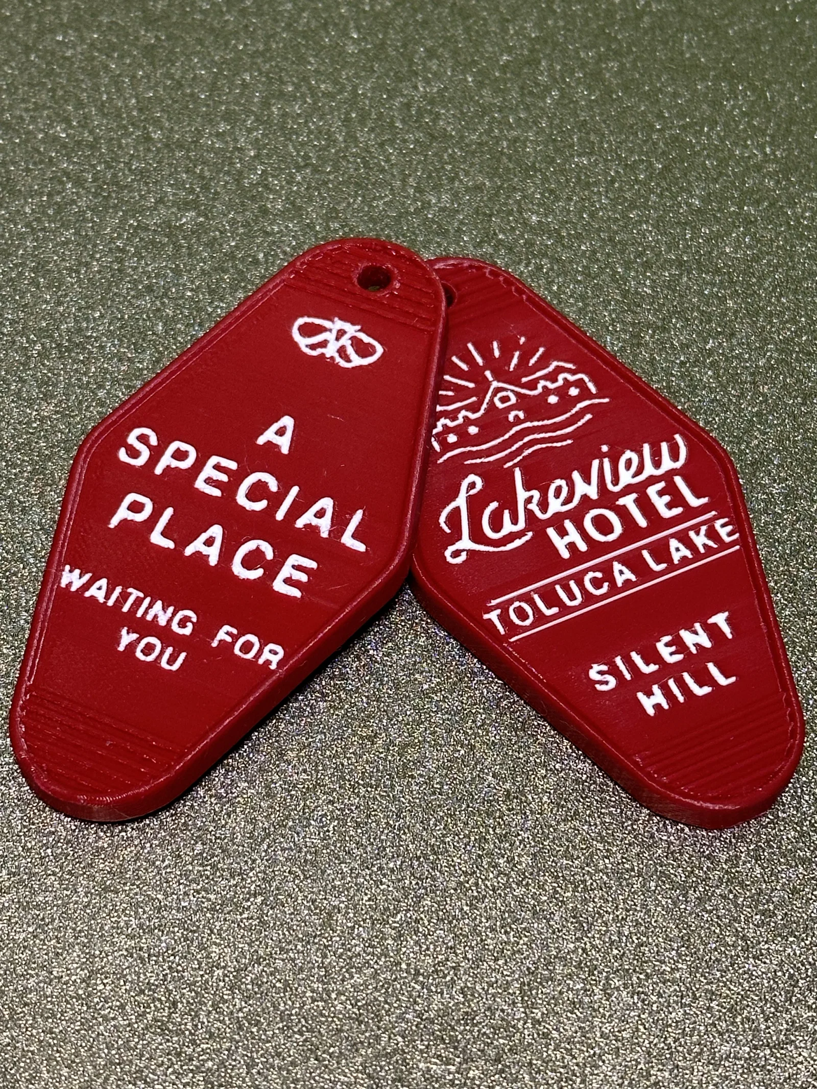 Móc khóa Lakeview Hotel trong Silent Hill 2, có 2 file STL: bản sát gốc và bản tối ưu cho nozzle 0.4 với chữ to hơn. Kèm hướng dẫn in (0.12 layer, nghiêng 45°, supports) và file multicolor đã paint cho BambuStudio.