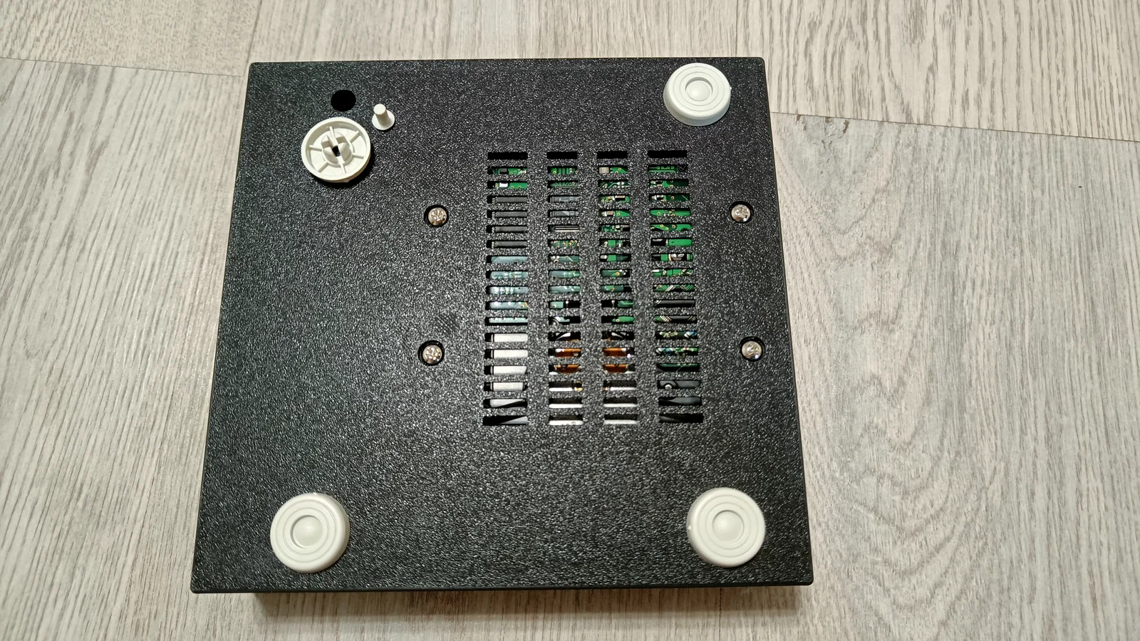 Chân đế dùng lại từ thùng máy tính cũ. Nếu không có thì có thể tự in chân khác. Nắp được cố định bằng vít tự khoan.