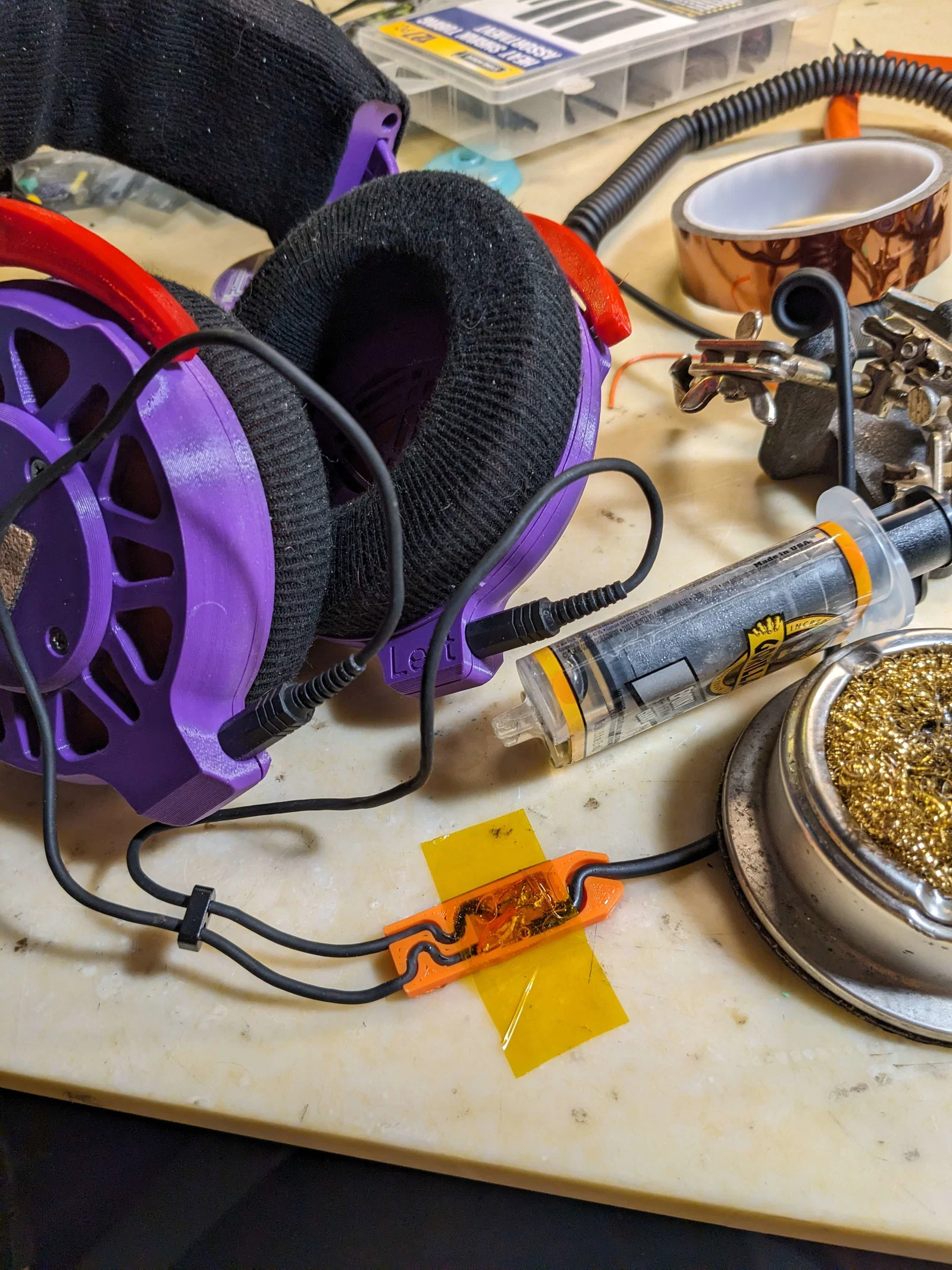 Mẫu Strain Relief wire splice giúp nối 3 dây aux để làm splitter. In đúng orientation, không cần supports. Hàn dây, dán kapton để cách điện rồi đổ epoxy/keo nến để cố định. Có kèm file FreeCAD, dễ chỉnh cho cỡ 3–4mm và size khác.