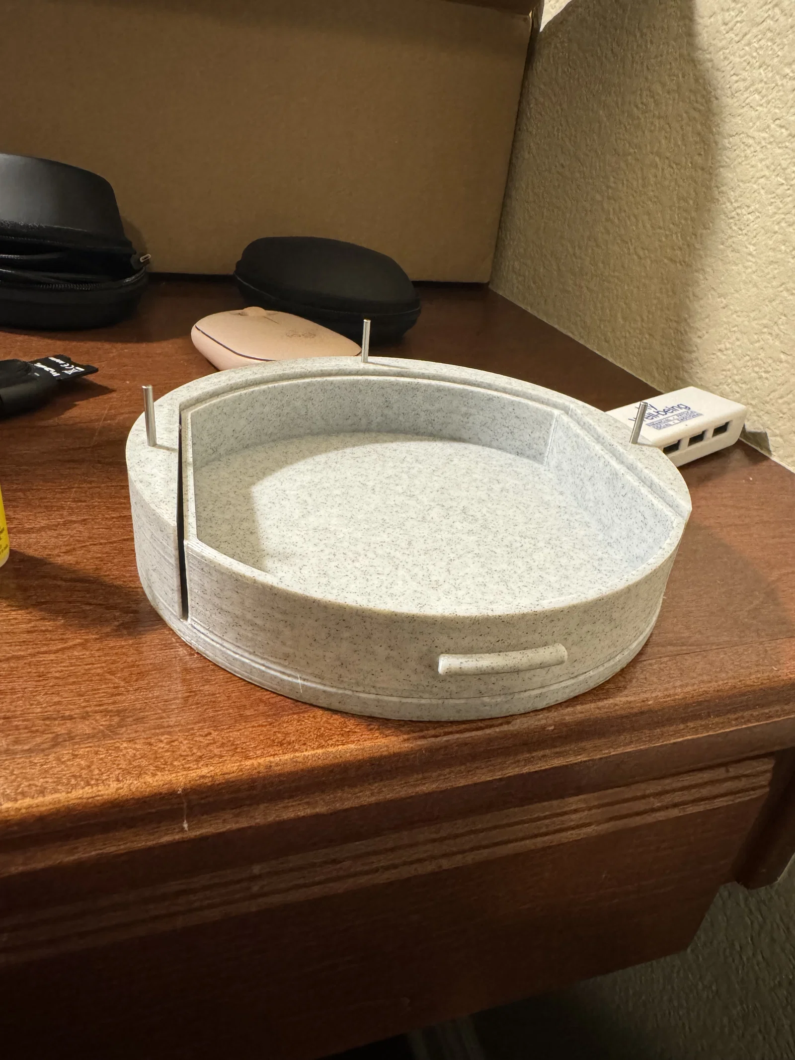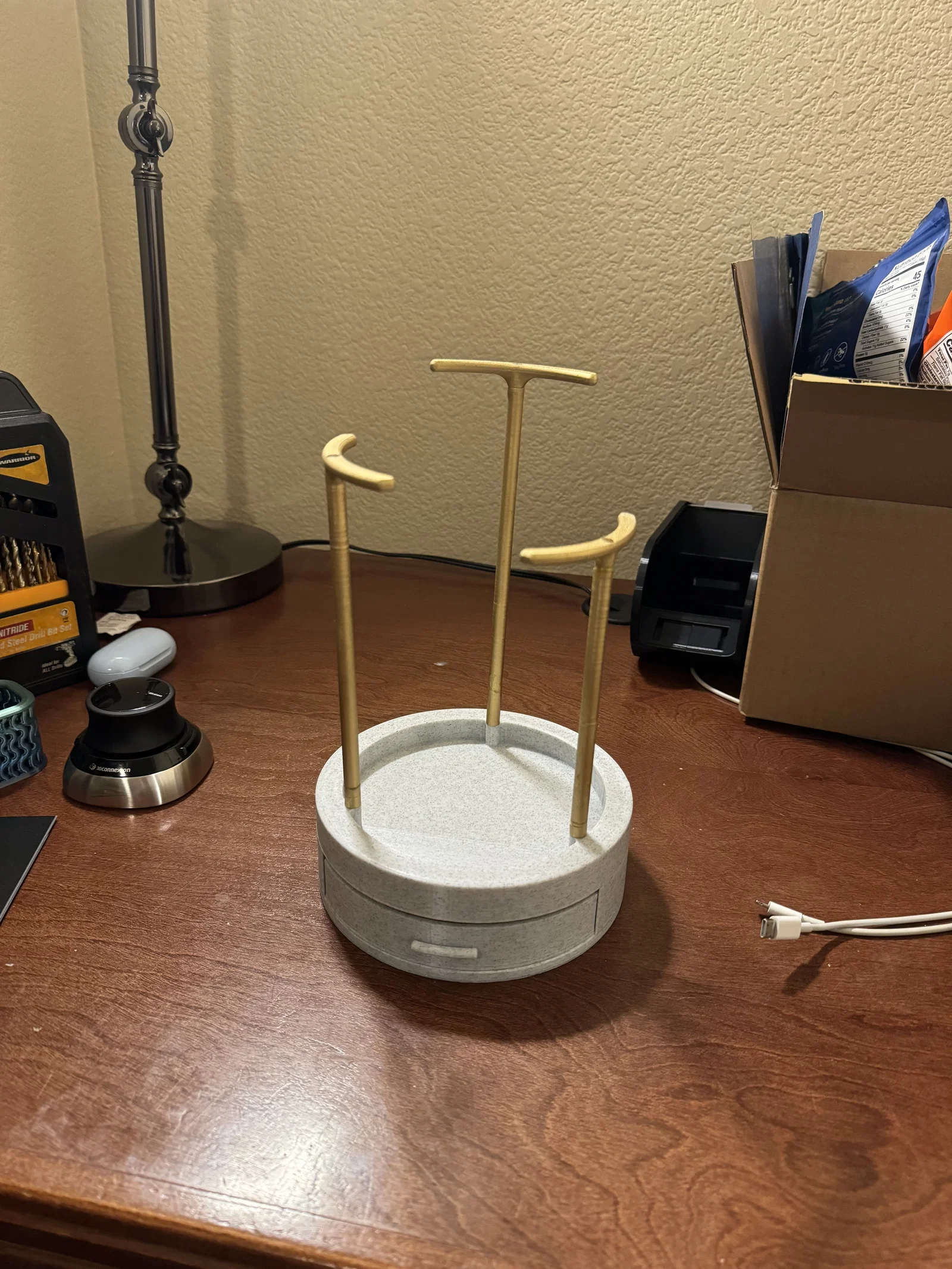 Kệ treo trang sức có 3 tay để treo dây chuyền và vòng tay, kèm khay và ngăn kéo để đựng nhẫn cùng phụ kiện nhỏ. Thiết kế tách phần để in không cần supports, lắp bằng vít 4-40 và chốt định vị.