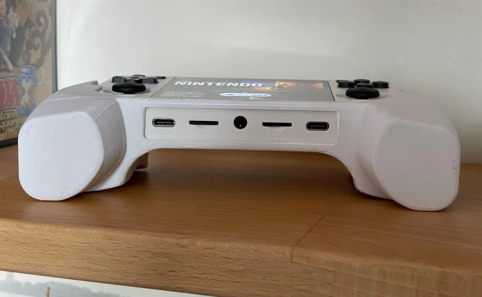 Tay cầm Powkiddy RGB30 Grip dành cho người tay lớn. Mẫu chia 2 phần cần dán sau khi in, có lỗ 5mm để gắn chốt định vị. Phần đáy có bản phẳng kiêm stand và bản truyền thống.