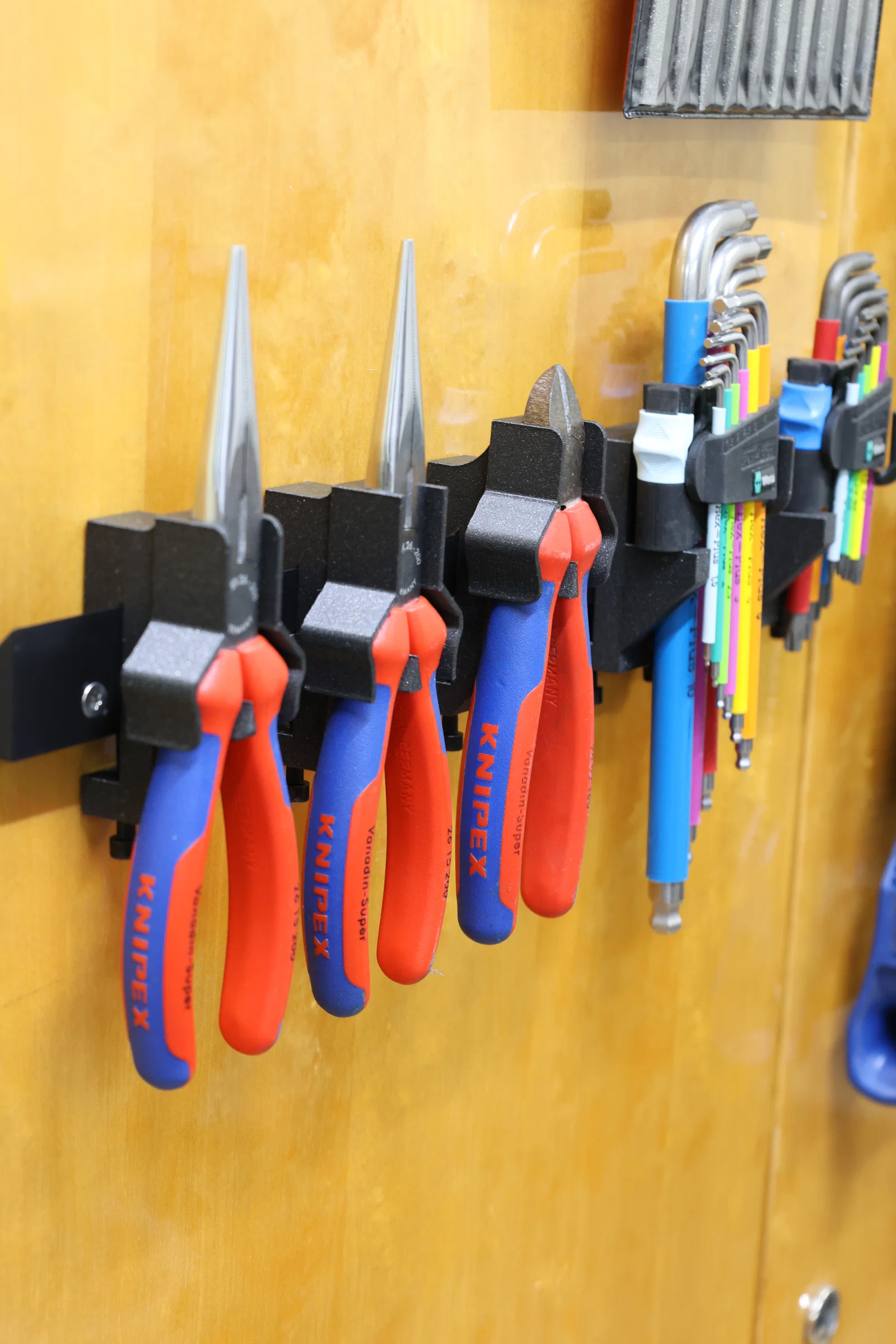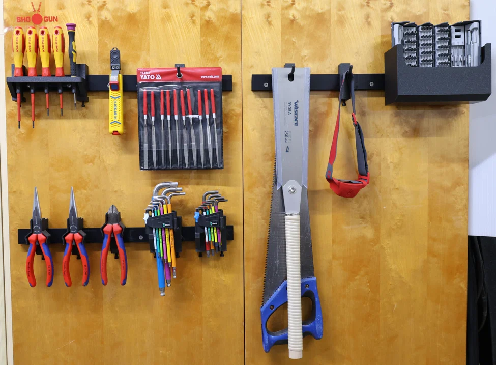 Bộ French Cleat System giúp sắp xếp đồ nghề và phụ kiện gọn gàng. Gồm các phần slat LH/Middle/RH để ghép theo chiều dài tùy ý, kèm cơ chế LOCK; hộp đồ nghề dùng insert ren M5 và vít M5x35 imbus để khóa.