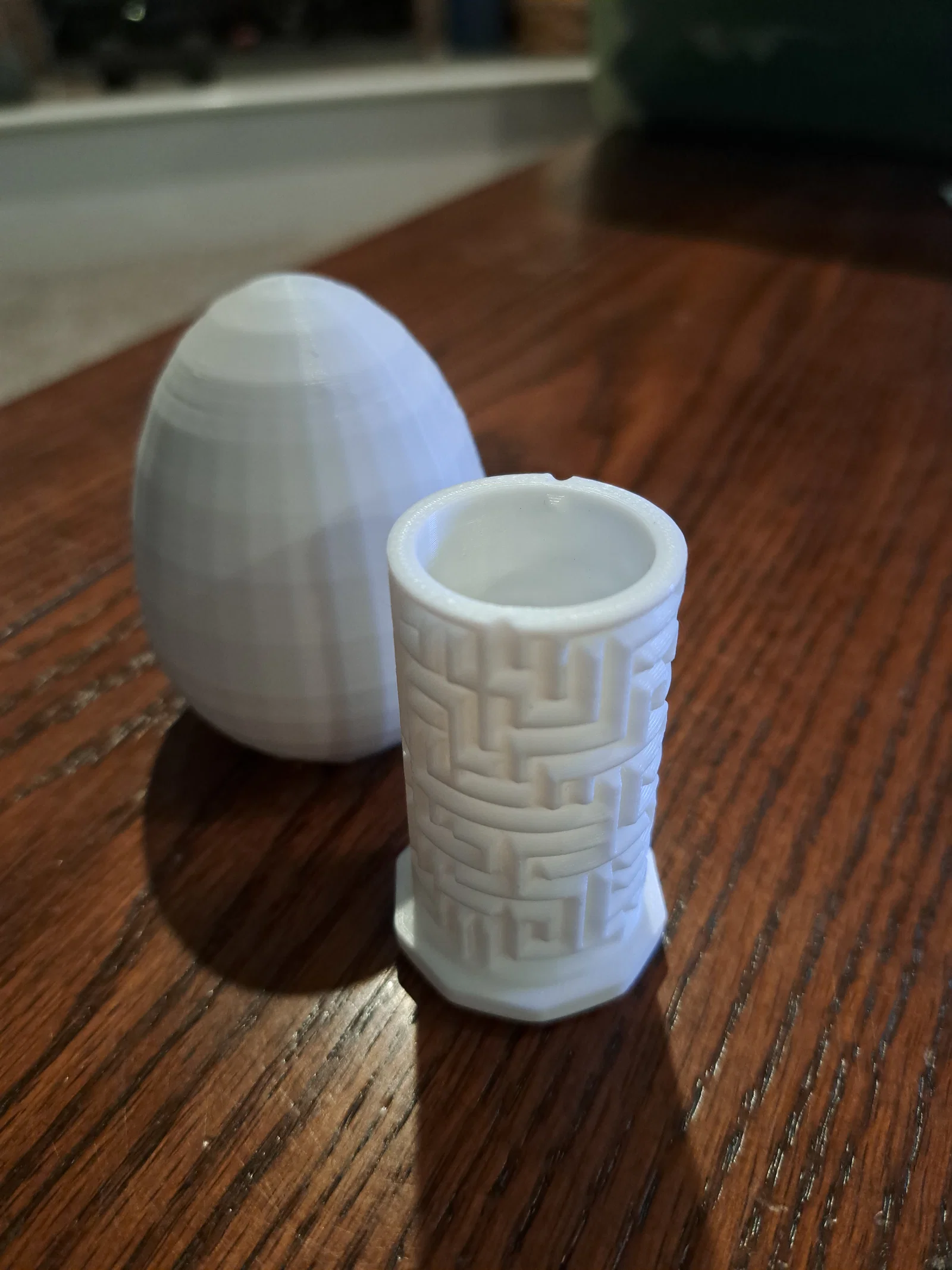 Cái notch ở mặt trong của trứng có thể cần chà nhám nhẹ tùy máy in của bạn, để khớp vừa với miếng maze.