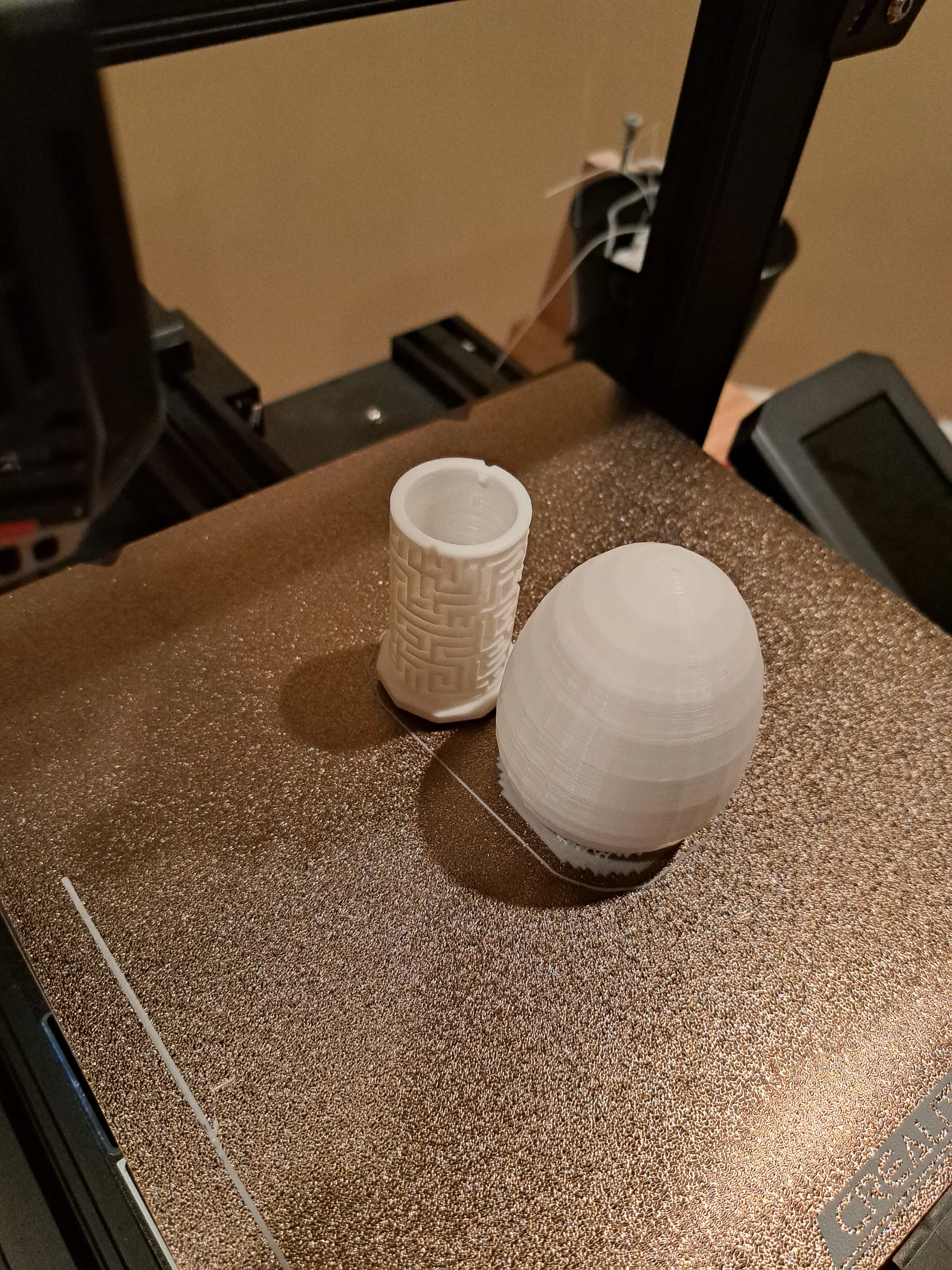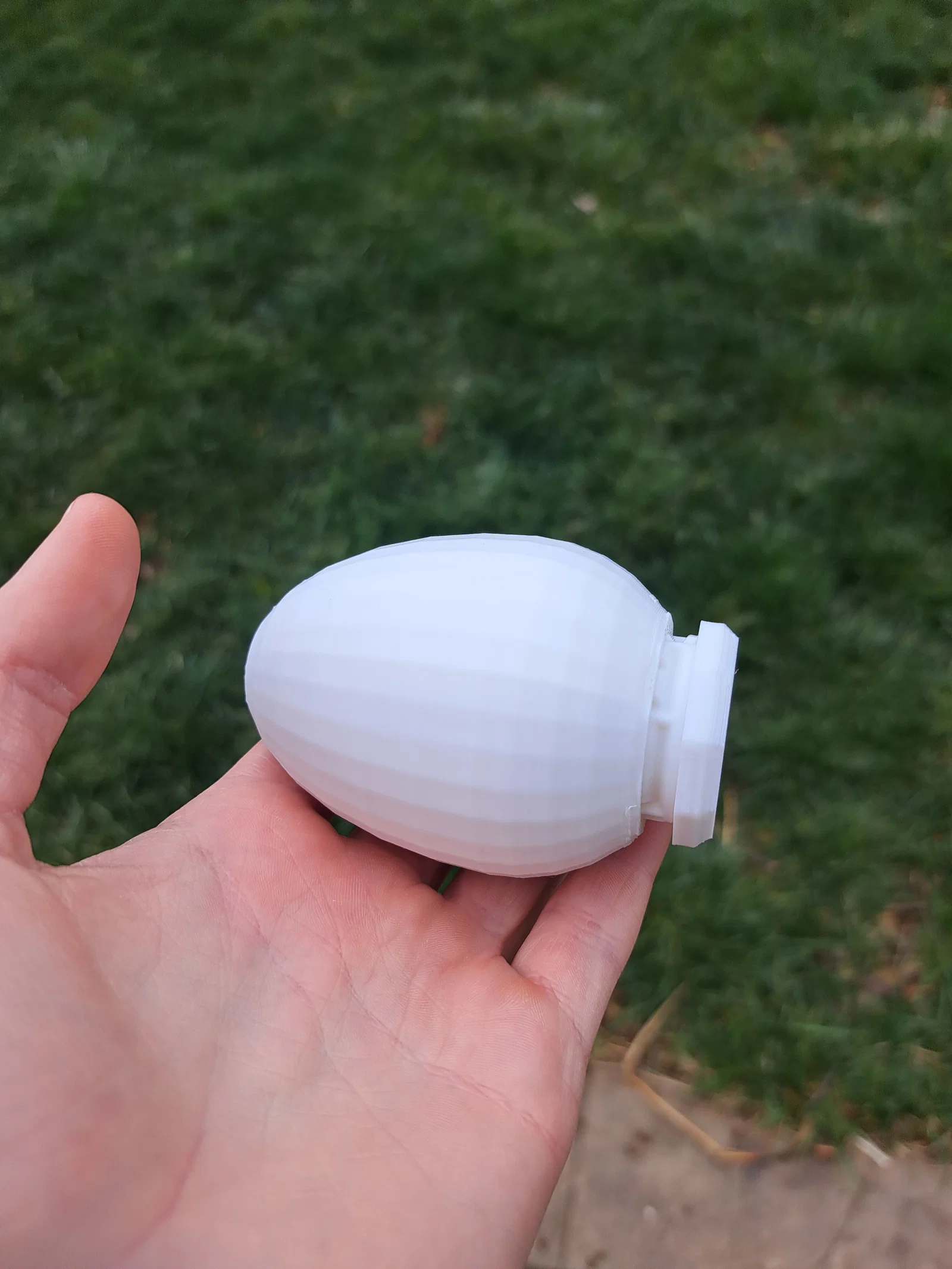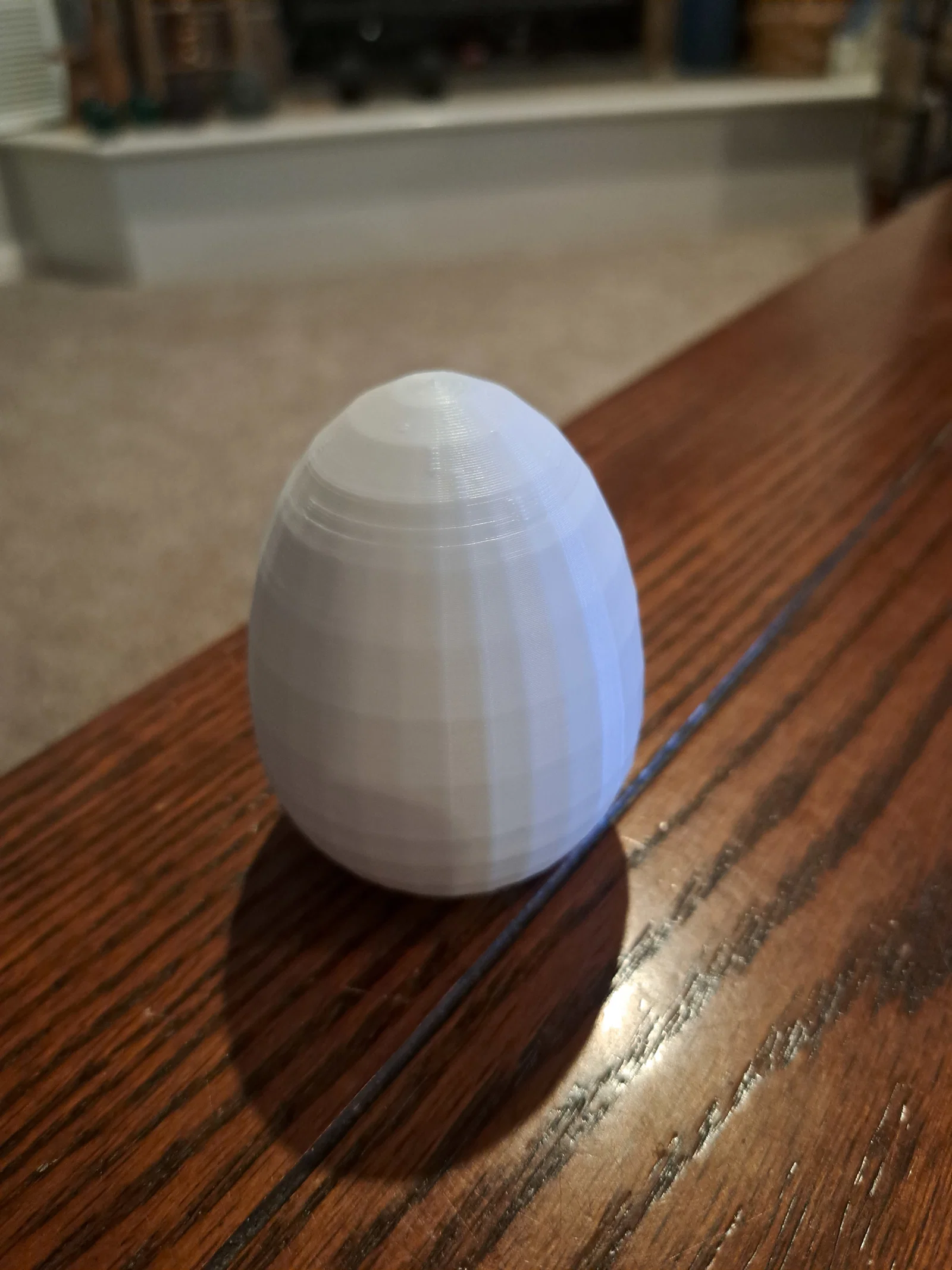 Mình khuyên in với nozzle 0.4 mm và layer height 0.2 mm. Phần trứng sẽ cần một ít supports ở phía đáy để giữ form, ngoài ra thì không cần gì thêm. Có thể in bằng gần như mọi loại filament. Mình in infill 15%, và về infill thì cỡ đó là hợp lý rồi, đừng tăng quá cao.