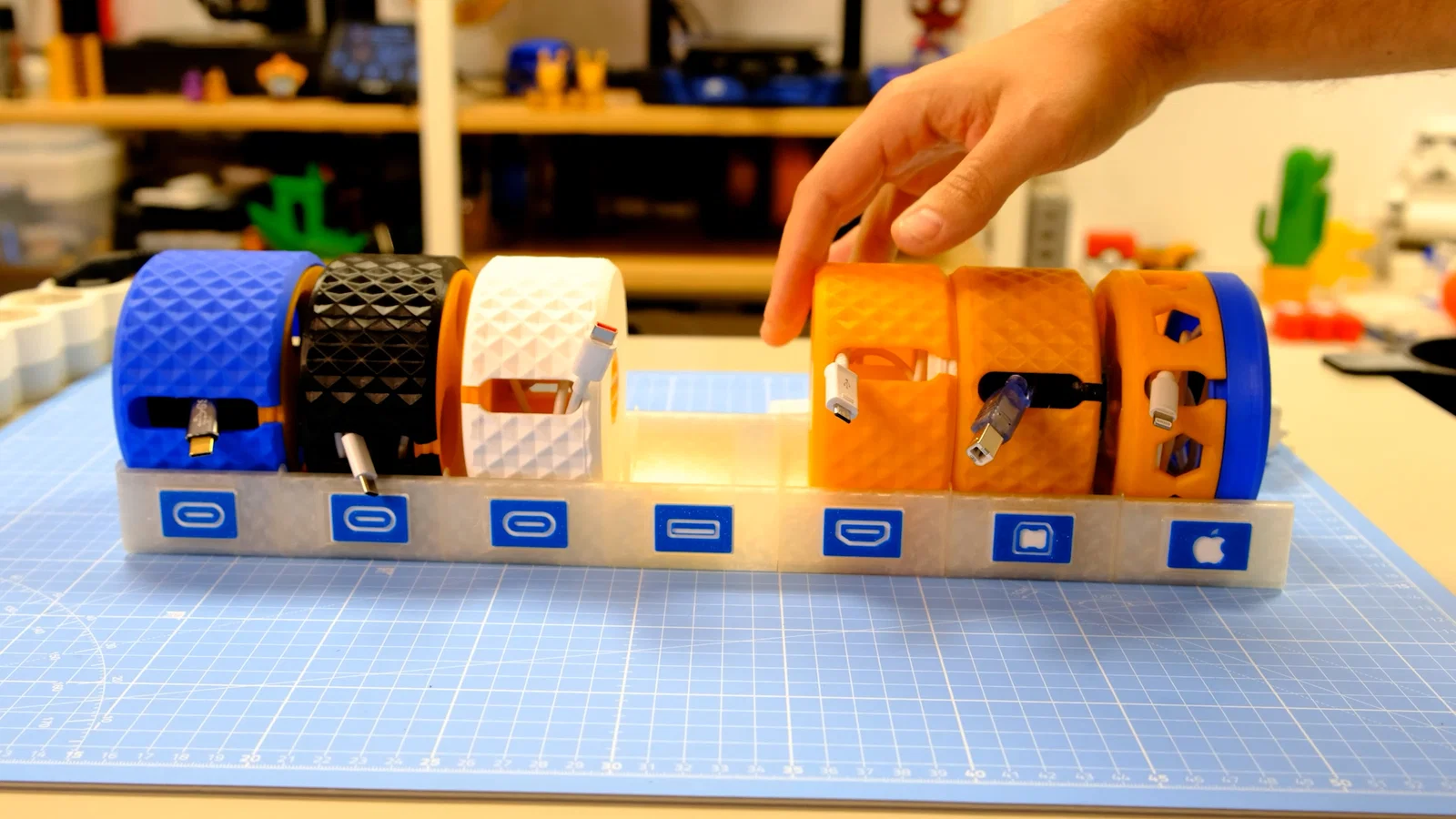 Bộ tổ chức dây cáp dạng xoay có peana/đế modular và nhãn nhận diện. Bản này scale gấp đôi từ các bản Normal (scale trong slicer) và bổ sung đế để sắp xếp gọn các bộ giữ/cốn cáp.