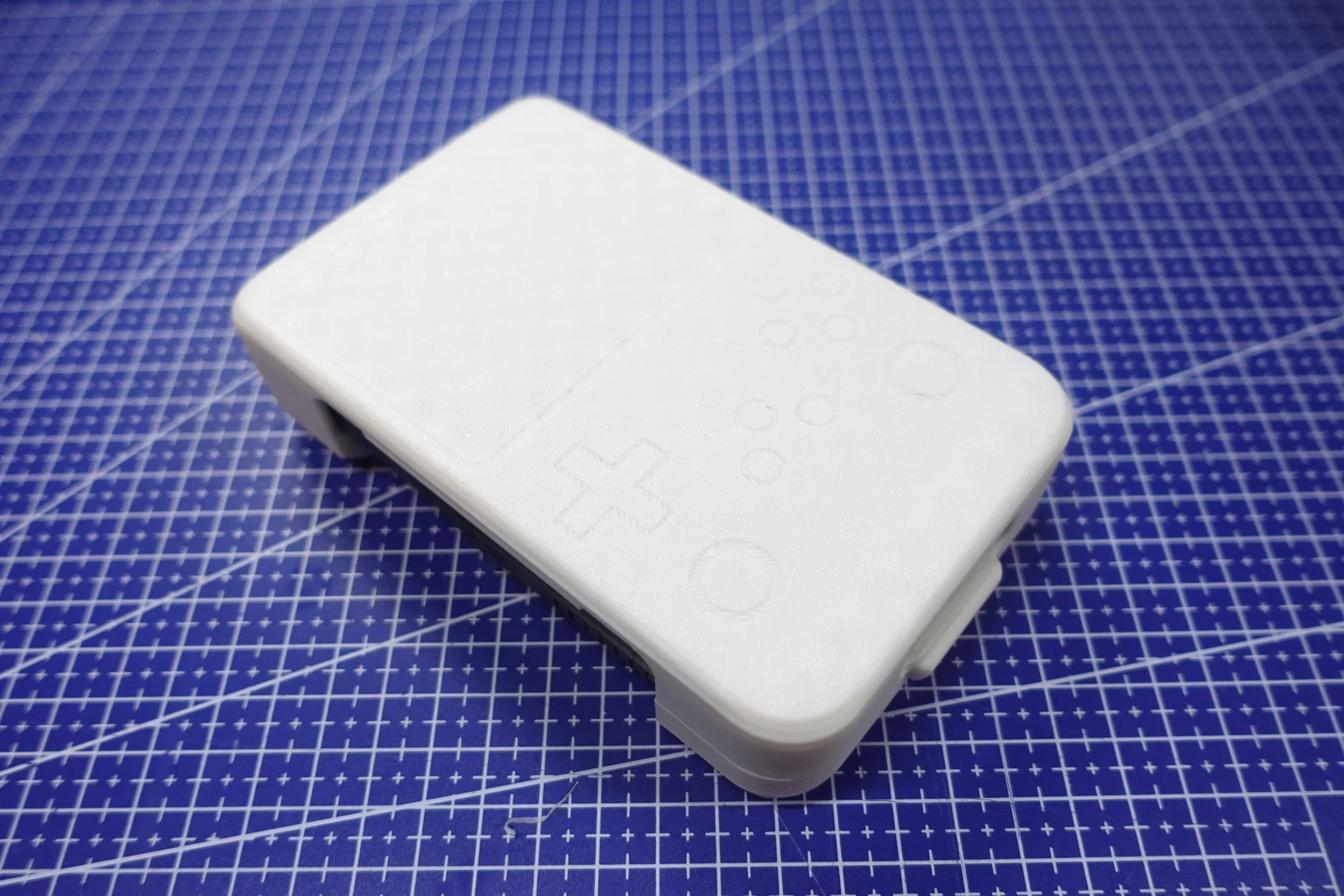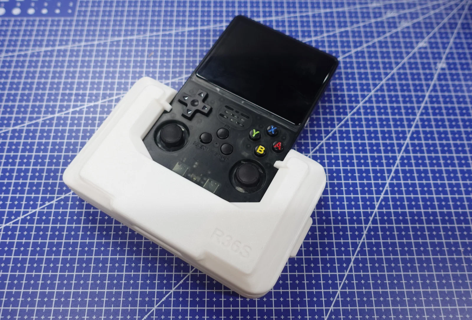 Ốp kiêm tay cầm và chân đế cho máy chơi game retro R36S. In kèm supports ở khu vực khe sạc gần clip, dùng một đoạn filament làm bản lề và chấm superglue hai đầu; dán thêm felt strip để máy ôm khít.