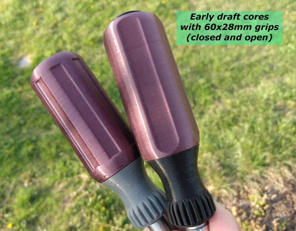 Tay cầm 2 mảnh kiểu Klein (rubber/acetate) dạng parametric trong SCAD, có 2 preset grip, hỗ trợ shank tròn/đa giác, tuỳ chọn lõi thép và through-shank. In PLA+TPU không cần supports, kèm STL 1/4" hex.
