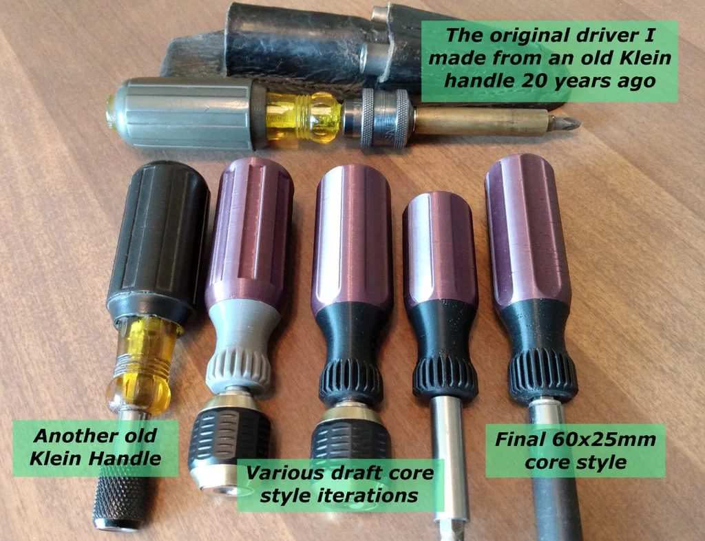 Mẫu này lấy cảm hứng theo kiểu tay cầm tua vít Klein dạng rubber/acetate, nhưng mình có chỉnh sửa thêm để cải thiện một vài điểm.