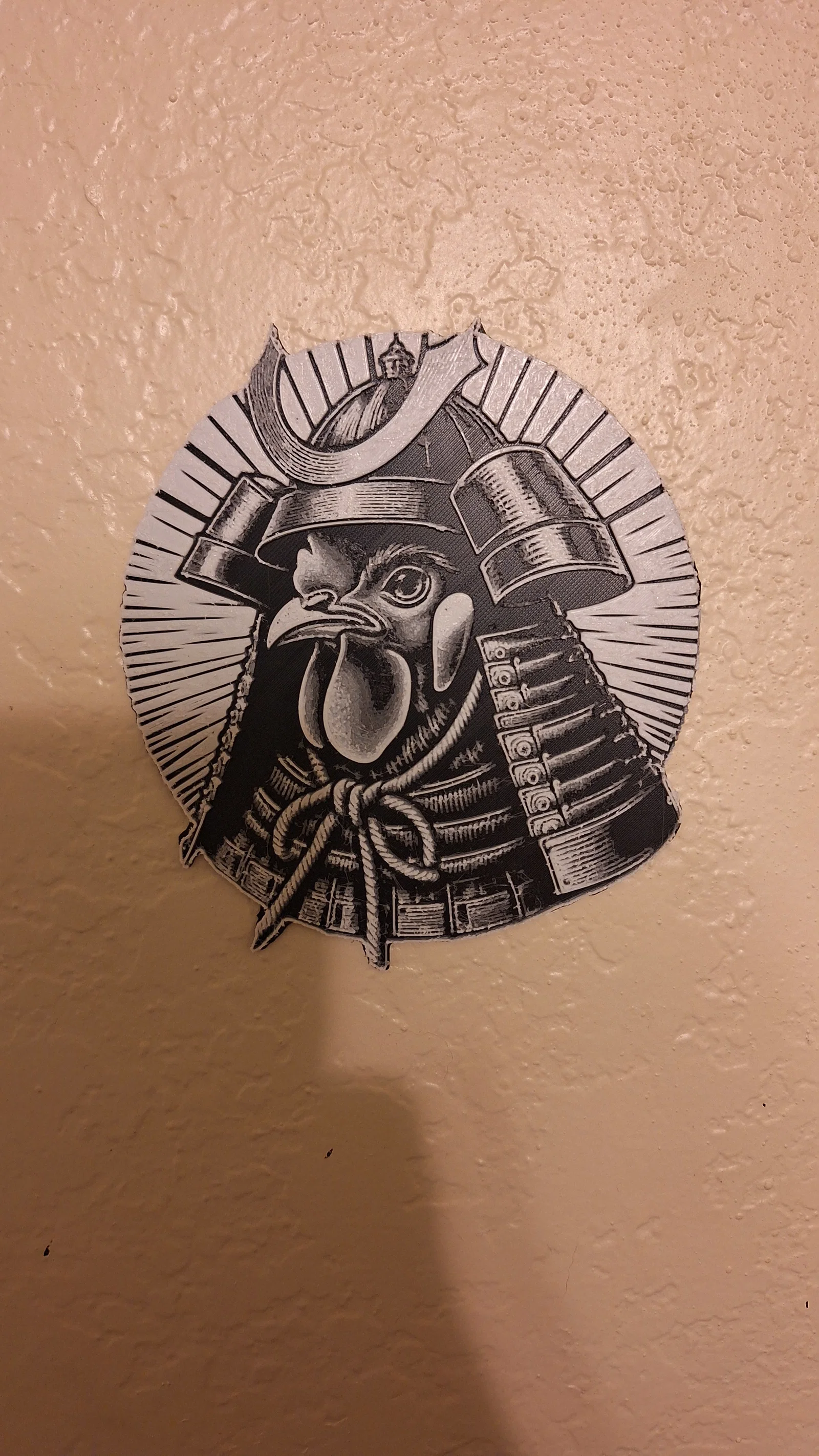 Đây là một bức chân dung vui vui của một chú gà ăn mặc như samurai. Ảnh được tạo bằng Microsoft Design và được dựng mẫu trong Hueforge. Cứ thoải mái thử các biến thể màu khác nhau nha. Phần gradient đen-trắng nhìn “mượt” cực.