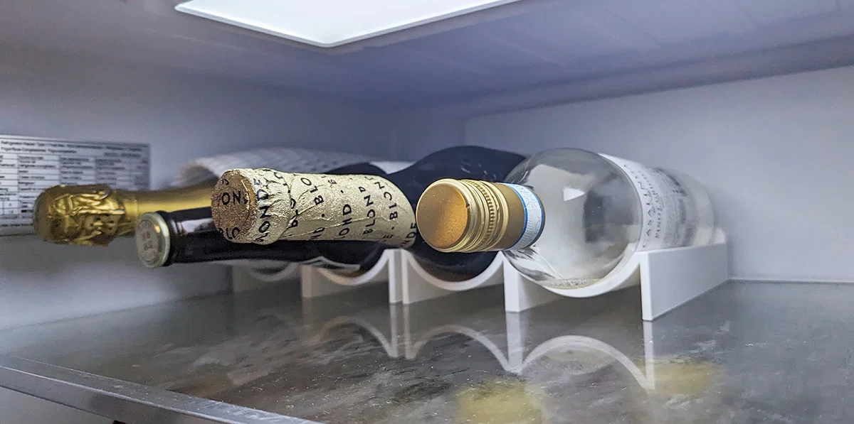 Giá đỡ chai rượu cho kệ tủ lạnh, chứa được 2 chai. Chai được đặt với phần đầu hơi cao lên, giúp hạn chế bị tràn trong tủ lạnh nếu lỡ nắp bị rỉ.