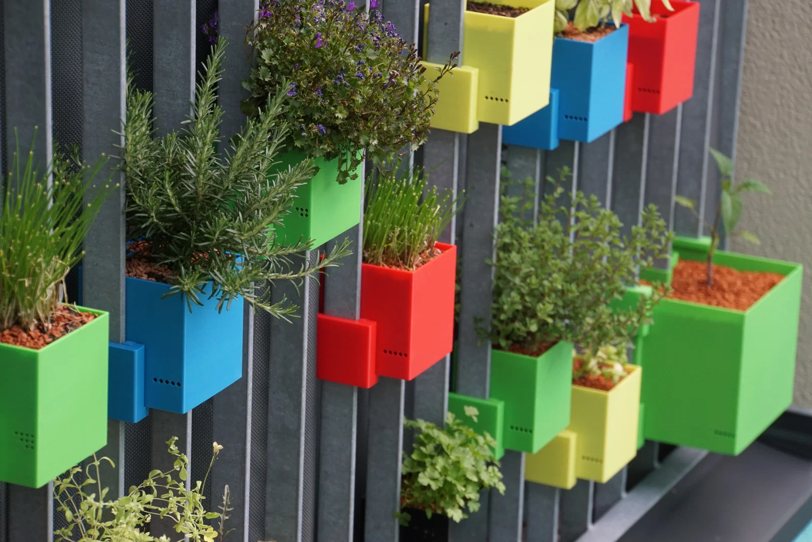 Mẫu chậu/khay trồng tự tưới dạng parametric để gắn lên lan can ban công. Có 2 kích thước, gồm 4 phần (thân chậu, khay chứa nước, phao báo mực nước, ngàm treo) và file OpenSCAD để tùy chỉnh theo lan can nhà bạn.