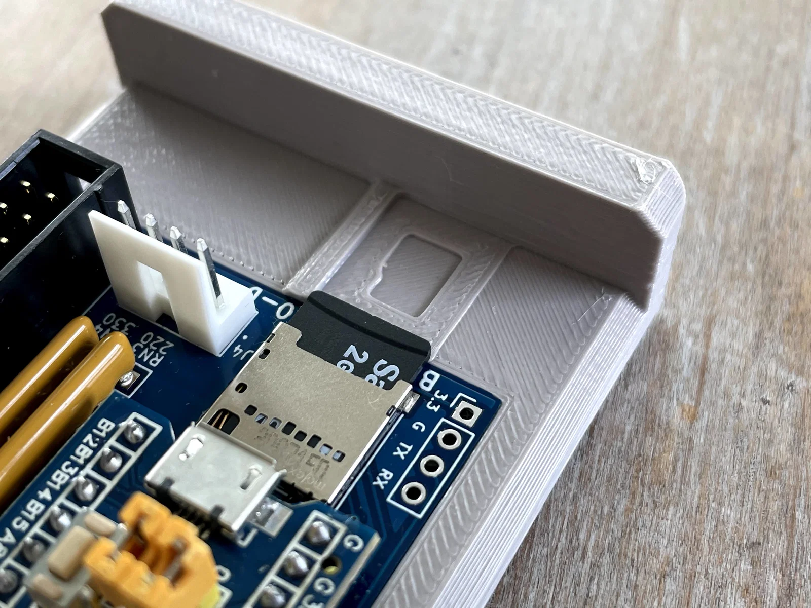 Bên dưới BlueSCSI có đủ khoảng trống cho các chân pin header và diode (ngay cả khi bạn không cắt bỏ chân pin khi lắp ráp). Bên hông có một khe khuyết giúp tiếp cận đầu cắm lập trình dễ dàng hơn nếu cần. Ngoài ra còn có một khay nhỏ giúp việc căn chỉnh và lắp thẻ MicroSD trở nên thuận tiện hơn.