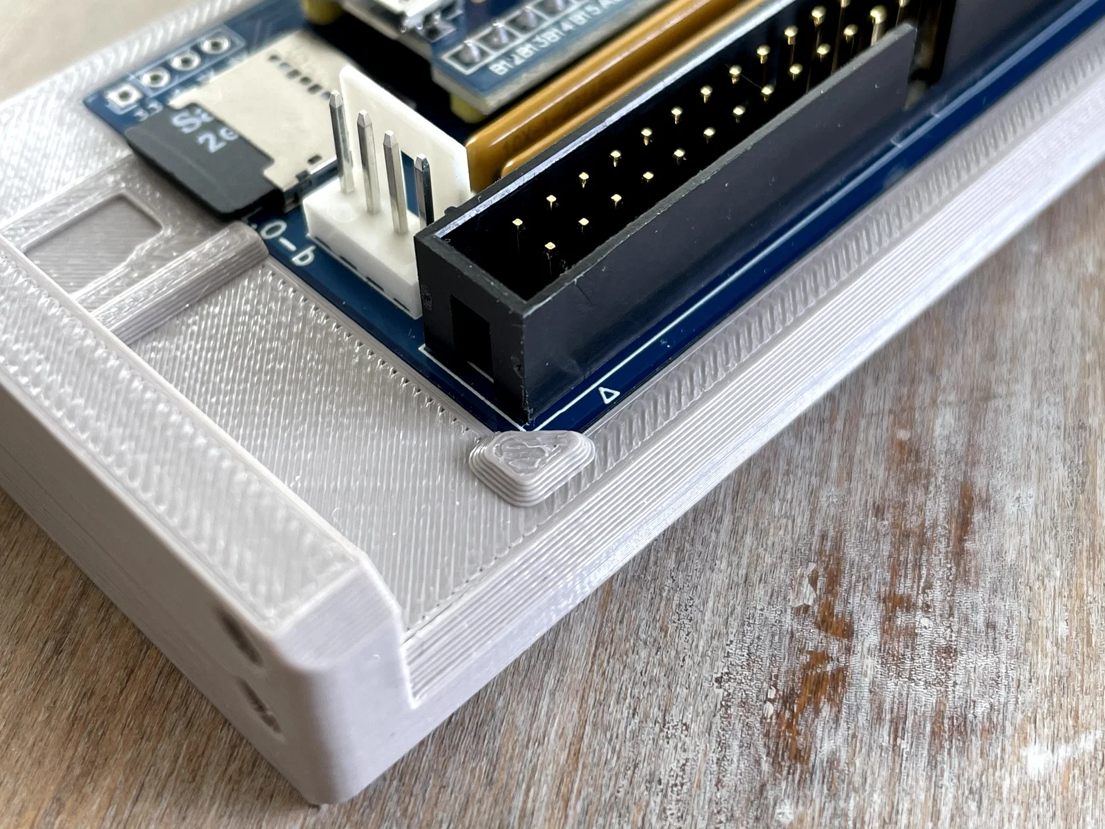 Để lắp BlueSCSI vào khung, đẩy mạnh nó về phía trước và luồn dưới các ngàm ở đầu khung. Dùng ngón cái ấn mạnh vào các góc của BlueSCSI cho tới khi nó khớp vào vị trí. Lần đầu lắp sẽ hơi cứng một chút - hãy đảm bảo là nó đã được đẩy sát về phía trước và nằm dưới các ngàm, sau đó nhấn mạnh vào từng góc còn lại. Để tháo ra, bạn chỉ cần uốn nhẹ khung như khay đá là BlueSCSI sẽ bật ra. Việc gắn thêm ốc M2.5 là tùy chọn.
