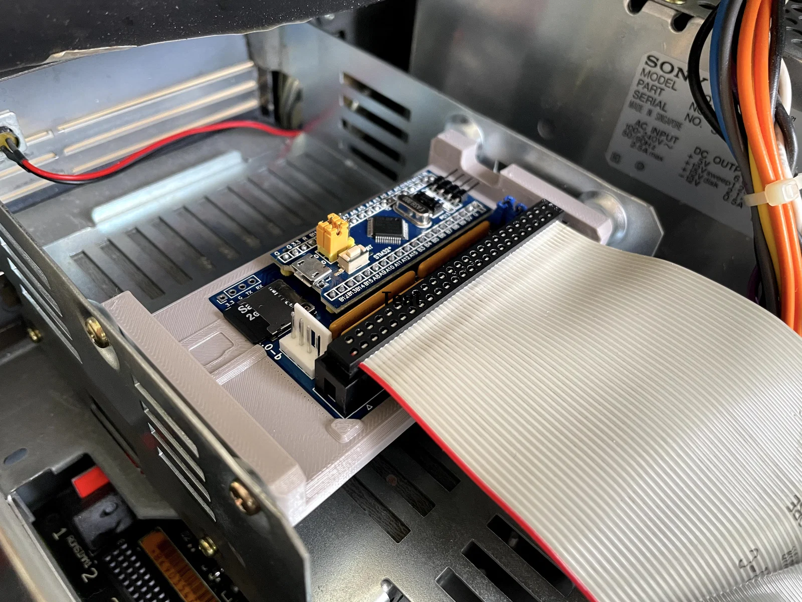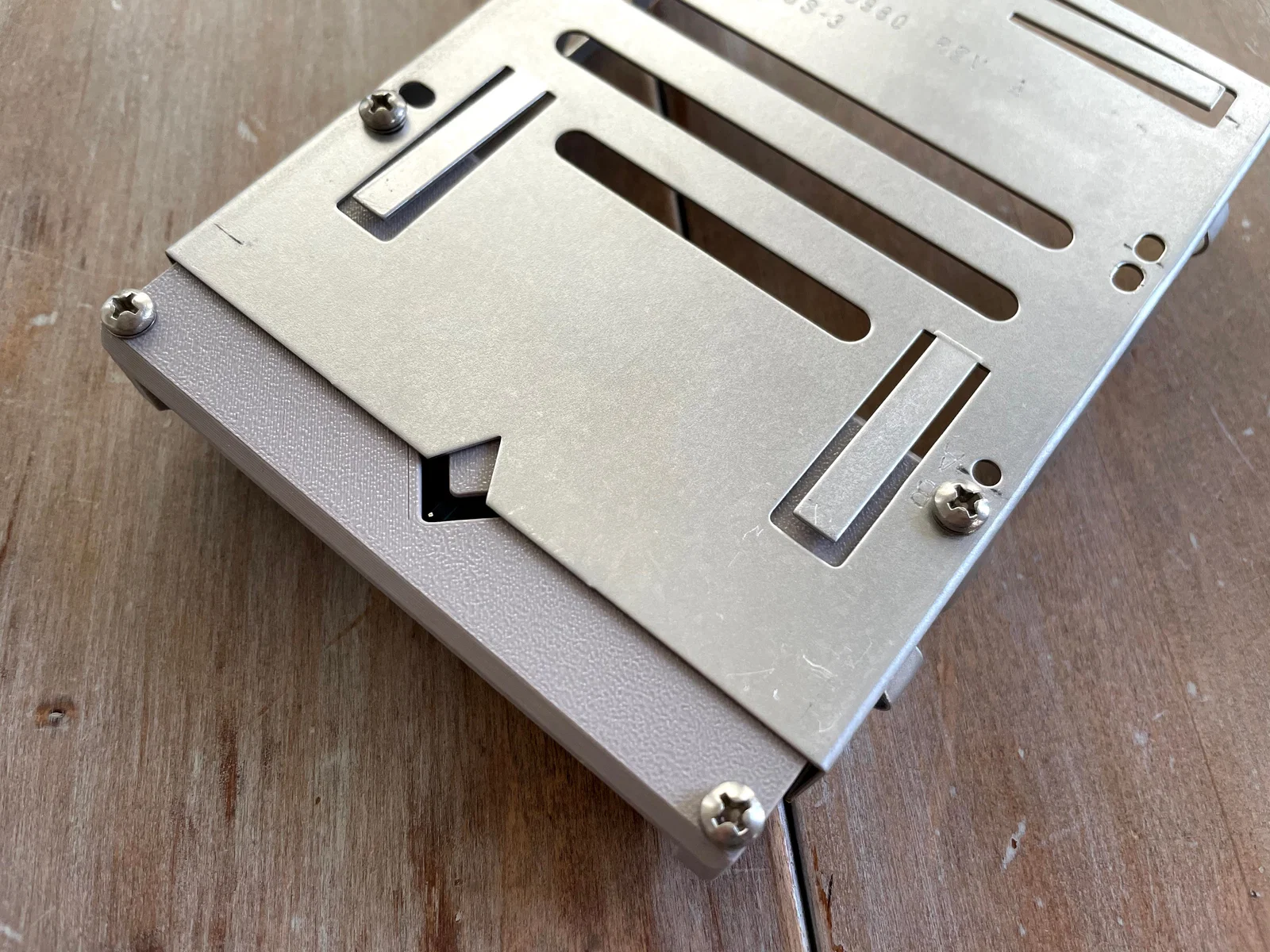 Cái khung in 3D này được thiết kế để gắn BlueSCSI vào khoang ổ cứng 3.5" của các dòng máy Macintosh cổ. BlueSCSI sẽ trượt vào các ngàm giữ gần đầu nối SCSI, bám chắc vào phía sau và bạn có thể tùy chọn cố định bằng một con ốc M2.5. Khung này sử dụng lại chính các con ốc ổ cứng zin của máy.