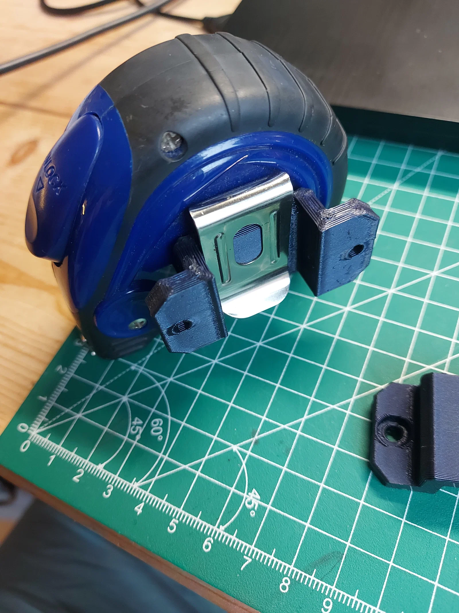 Ngàm gắn thước dây (Tape Measure Mount) đơn giản, tận dụng kẹp kim loại của thước. Có kèm file Fusion để chỉnh sửa. Thiết kế hiện tại phù hợp với kẹp rộng tối đa 25mm, lắp bằng 2 vít gỗ 3mm x 15mm.