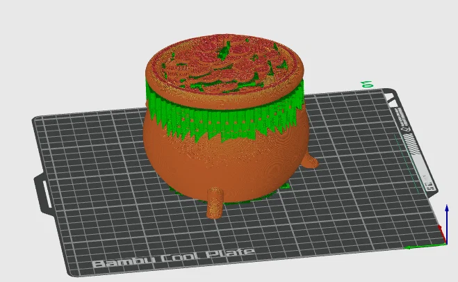 - Hỗ trợ in (Supports): Do mô hình có phần miệng hũ chứa nhiều chi tiết tiền chồng chất, bạn bắt buộc phải thiết lập hỗ trợ (supports) để đảm bảo các cạnh được in sắc nét và không bị võng.