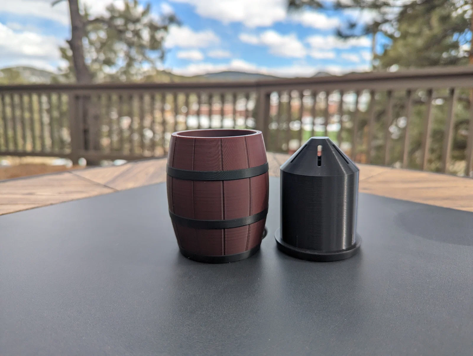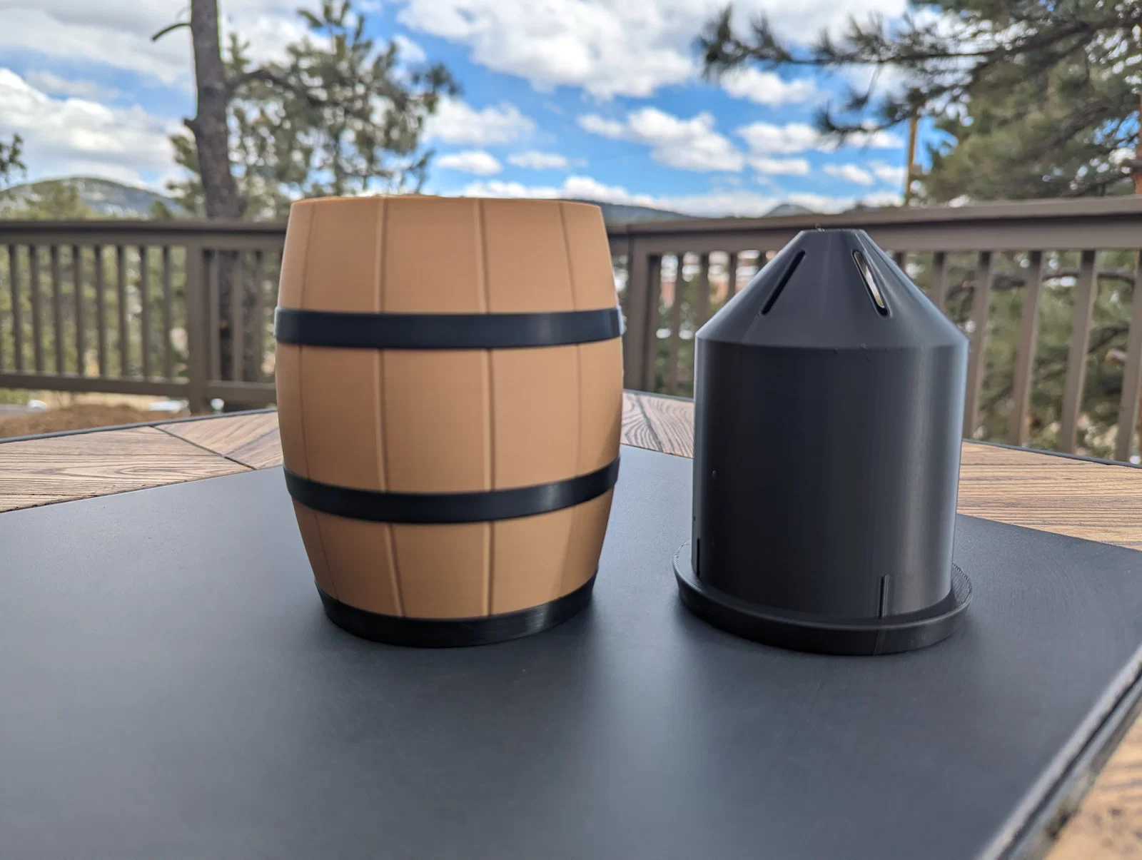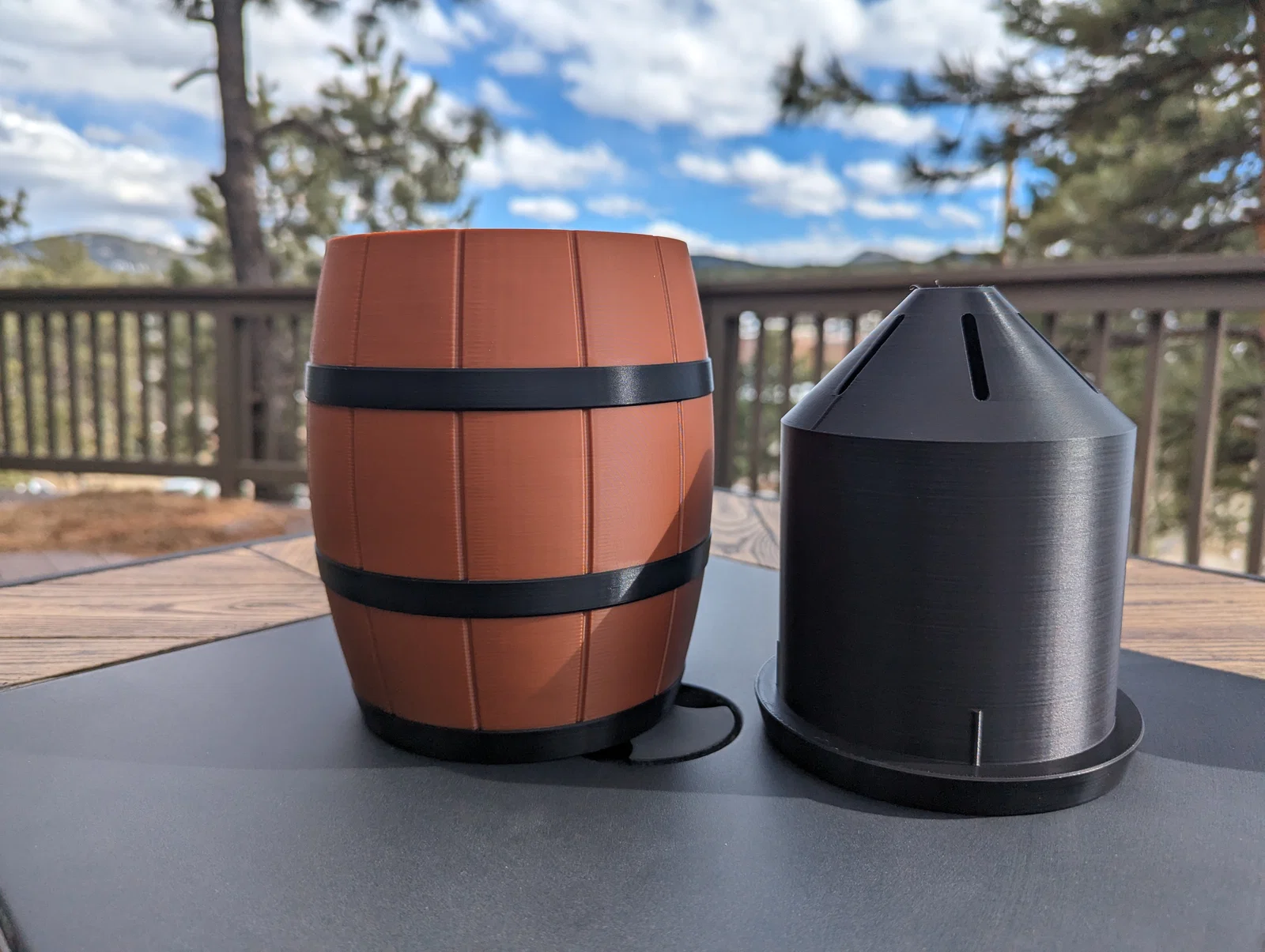 Barrel Planter là chậu trồng dạng thùng, hợp trồng rau thơm hoặc hoa. Có thể dùng kiểu self-watering bằng wicking material ở đáy insert, hoặc tưới từ trên như bình thường. Thân chậu kín nước, không rò rỉ.