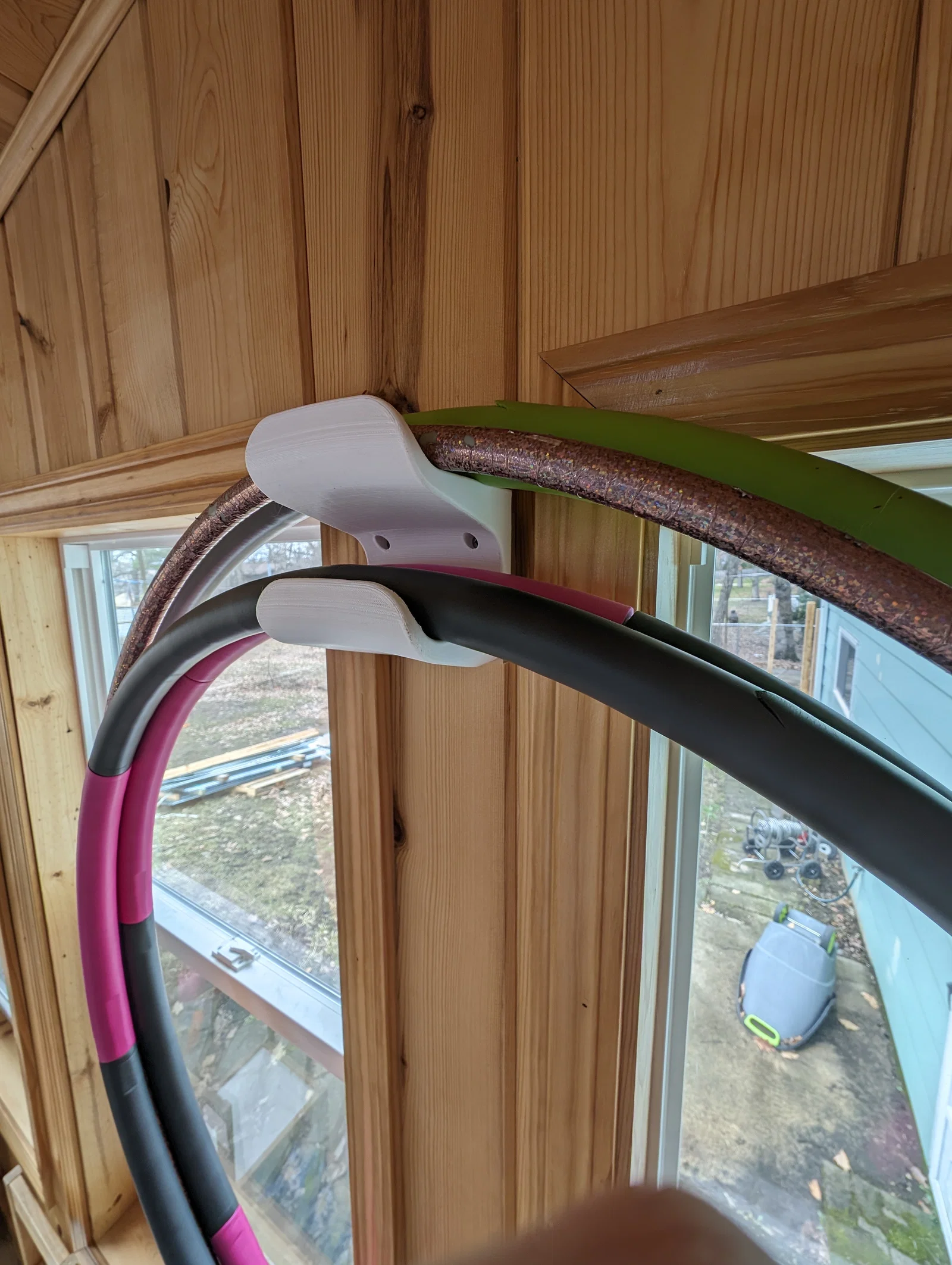 Giá treo hula hoop gắn tường, treo được tối đa 4 vòng: 2 vòng lớn ở móc trên và 2 vòng nhỏ ở móc dưới. Móc uốn cong theo vòng để không làm trầy xước. In nằm nghiêng, không cần support.