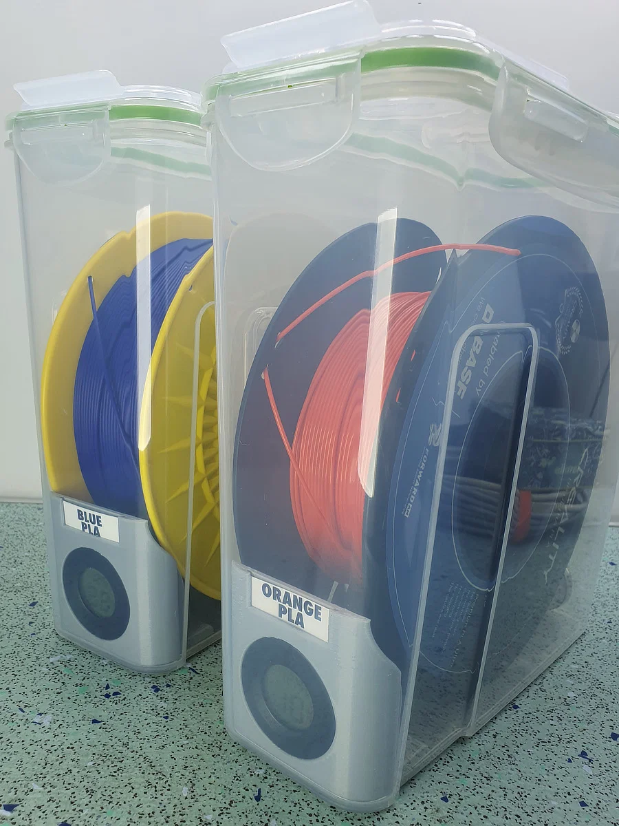 Hộp lưu trữ HPL951 là lựa chọn mình hay dùng để cất cuộn filament in 3D 1.75mm loại 1Kg. Thêm một đồng hồ đo RH (Relative Humidity) dạng tròn giá rẻ sẽ cho bạn biết độ ẩm của không khí xung quanh filament, và từ đó cũng ước lượng được độ ẩm của chính filament.