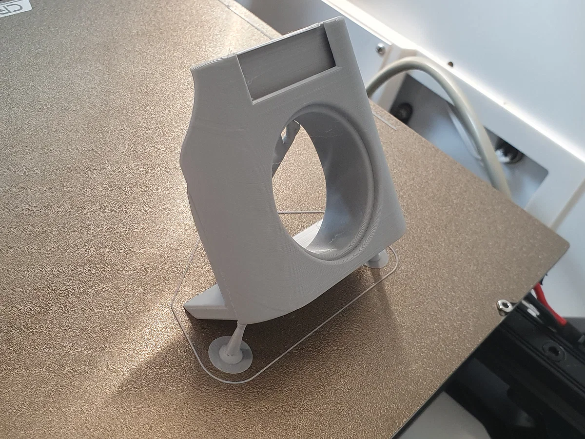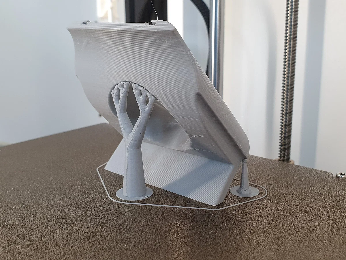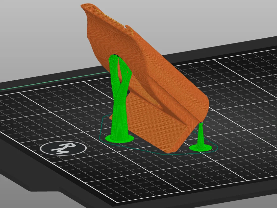 In theo hướng đặt cạnh hẹp xuống như hình minh hoạ thì chỉ cần support (organic) tối thiểu mà vẫn xử lý được overhang tốt ở các phần tròn (cần bám dính tốt trên mặt bàn in PEI nhám — máy bed slinger có thể cần thêm brim).