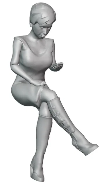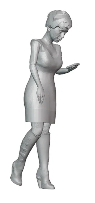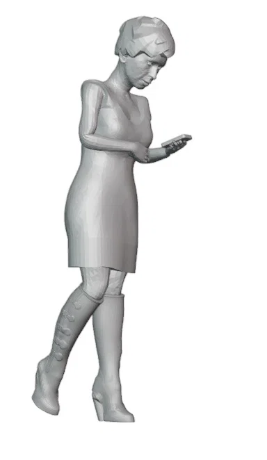 Thiết kế của mẫu này hướng đến sự tinh tế với tư thế tự nhiên, giúp người xem dễ dàng hình dung ra bối cảnh sống động. Dù được thiết kế tối ưu cho tỉ lệ 1:76 (h0scale), mô hình vẫn sở hữu độ chi tiết ấn tượng, từ những nếp gấp trên váy cho đến dáng vẻ cầm điện thoại đặc trưng. Bạn hoàn toàn có thể tùy chỉnh kích thước khi in để phù hợp với các hệ thống sa bàn khác nhau mà vẫn giữ được độ sắc nét cần thiết cho một tiểu cảnh thu nhỏ.