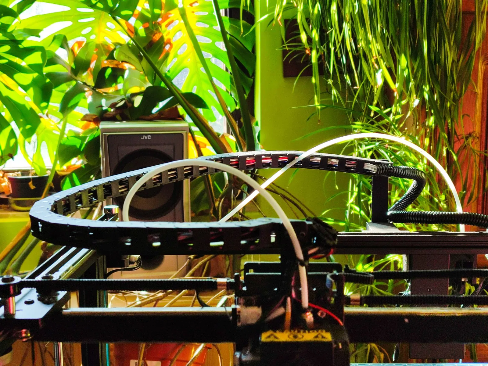 Đầu in của máy in core XY này được cấp nguồn cho các cảm biến và bộ điều khiển bởi một khay cáp ban đầu được cố định ở phía sau trên khung máy ở phía trên.