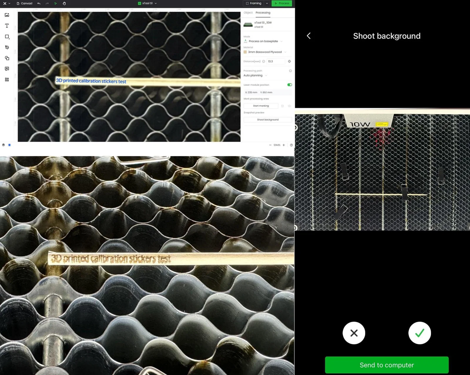 Bộ “sticker” calibration có chốt cho xTool S1 để đặt cố định trên honeycomb, hỗ trợ chức năng Shoot background trong XCS 2.0. Có 2 bản normal và tight; khuyến nghị in 0,2mm và phối màu đen/trắng phù hợp.