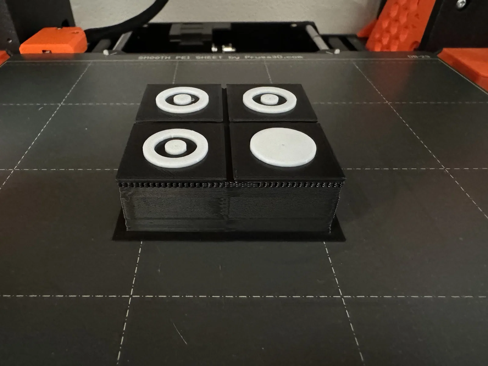 Mình thử in trắng ở dưới và đen ở trên nhưng bị vấn đề dính bàn in (bed), nên mình đổi lại: đen ở dưới và trắng ở trên.