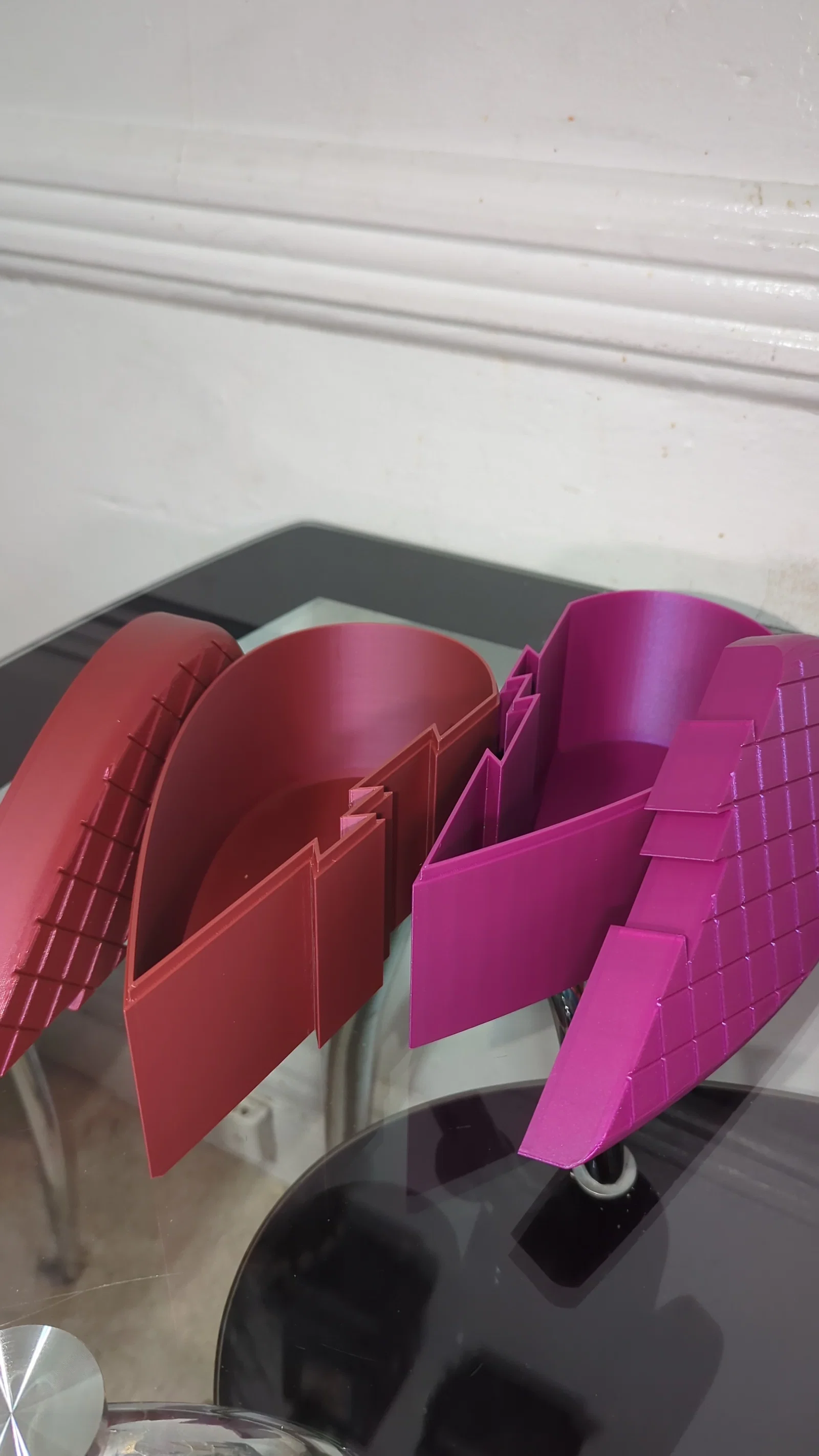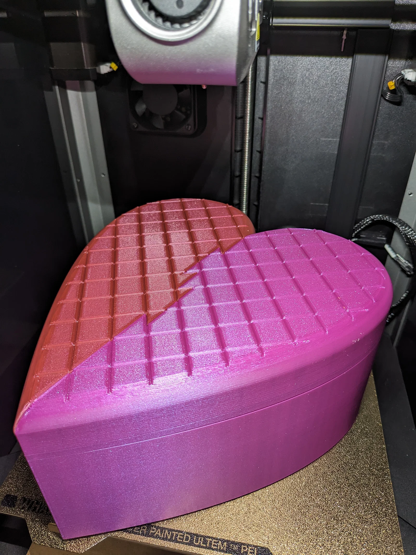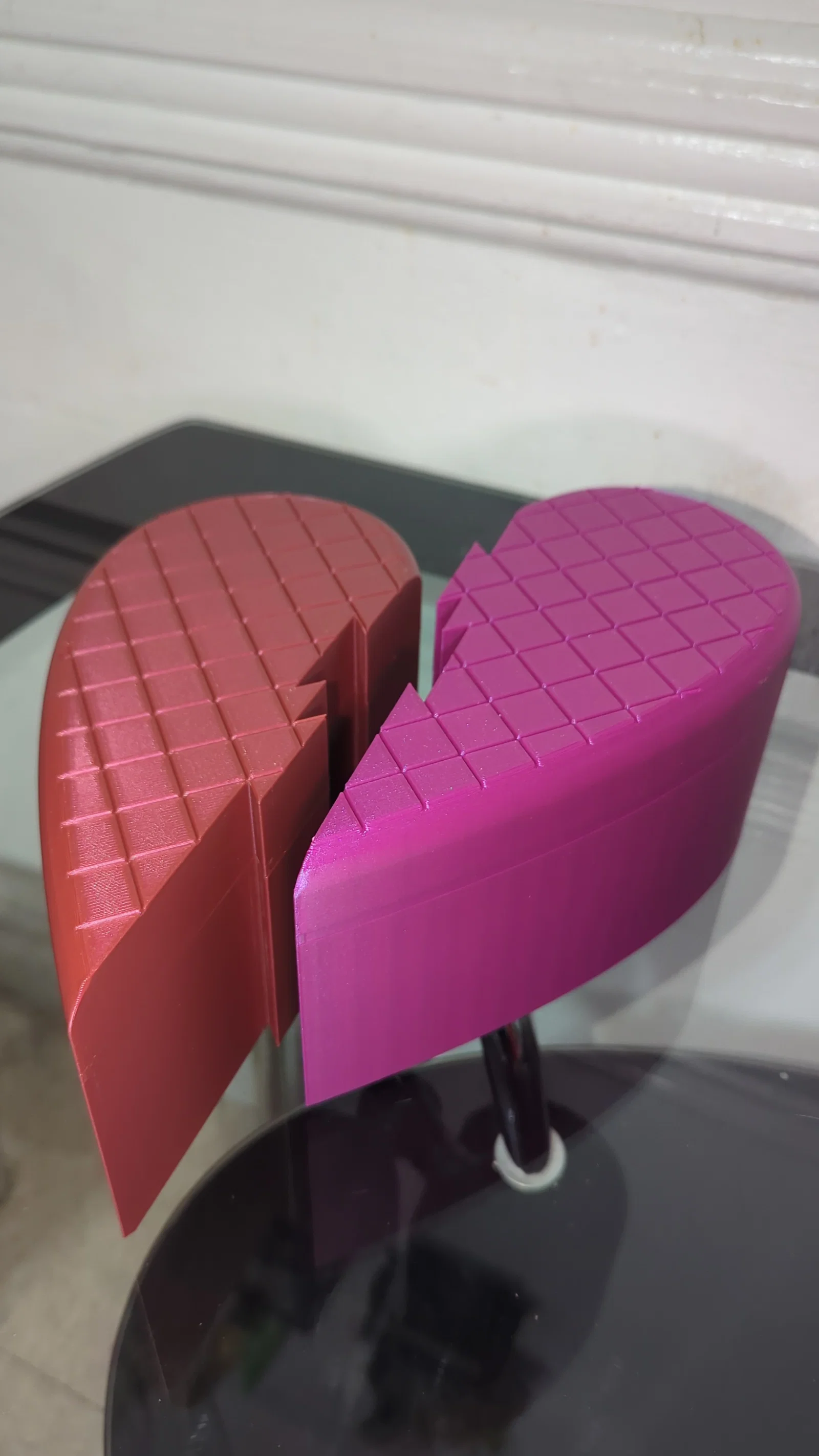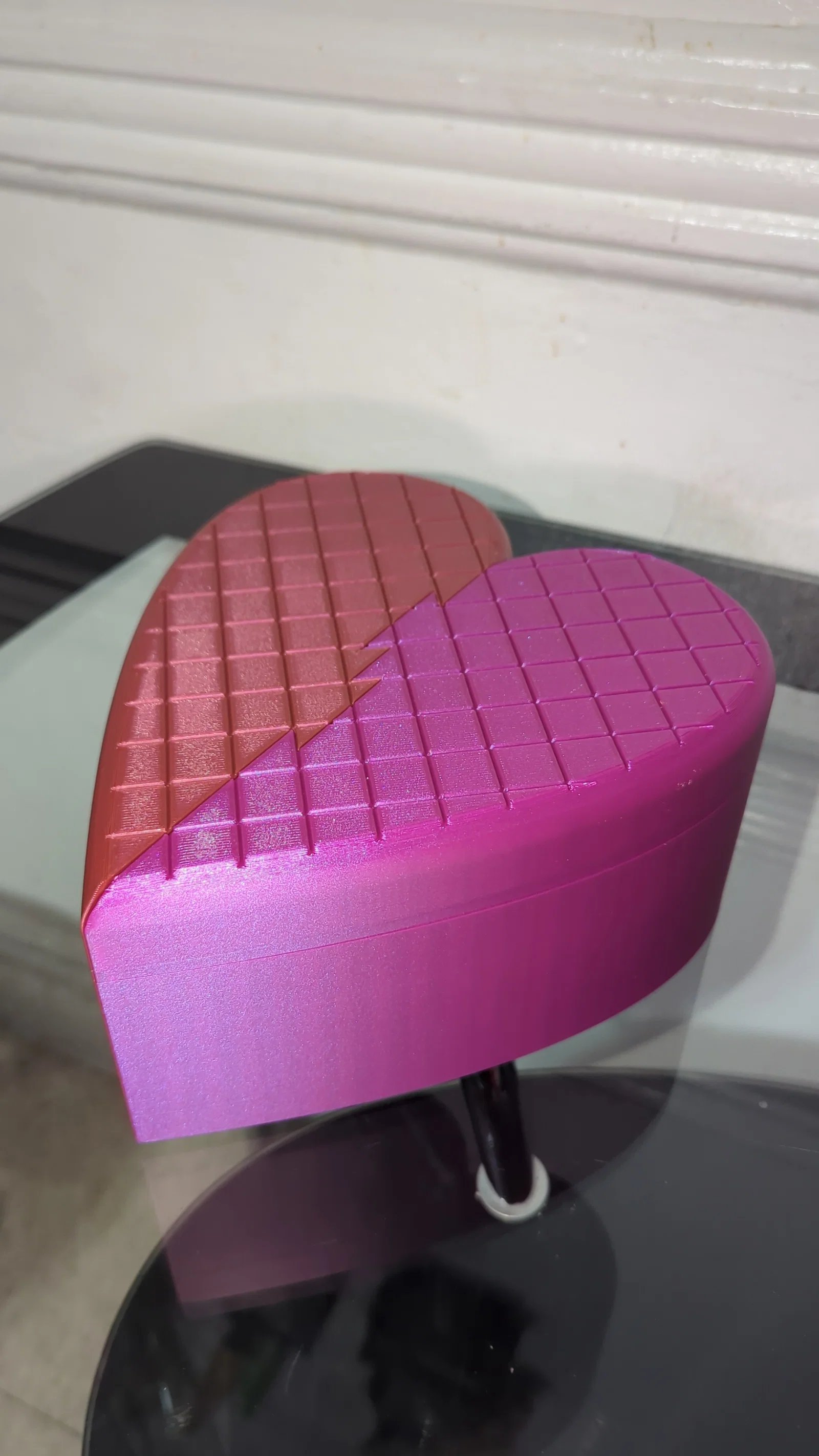 Mẫu Hộp Trang Sức Trái Tim 2 Mảnh dễ in, không cần supports. Tham khảo thông số: nozzle 230°C, bed 60°C, layer height 0.2mm; thời gian in đáy 3h48 và nắp 1h47. STL bởi dsk001_3d.