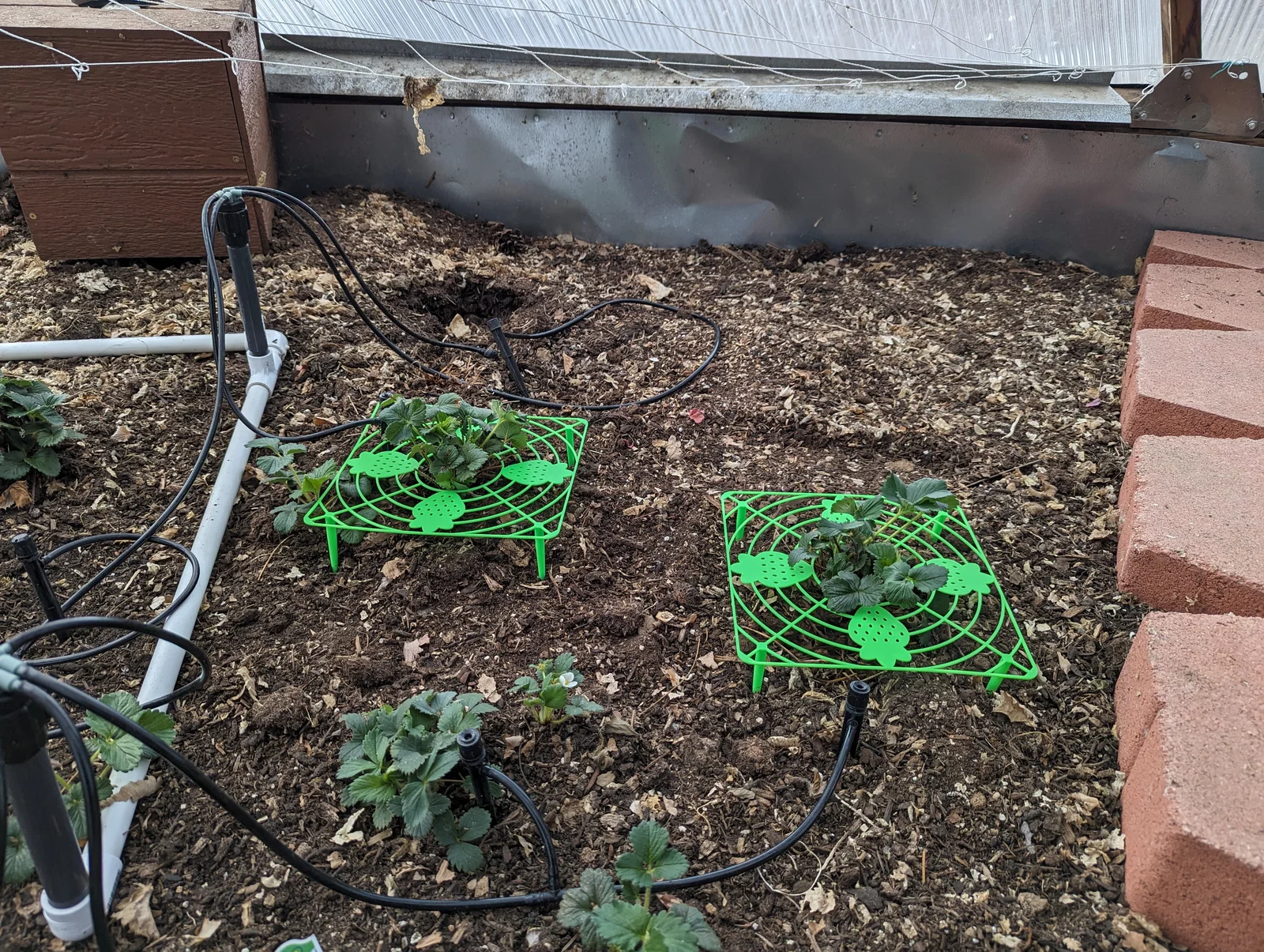 Năm ngoái sâu bọ ăn mất khá nhiều trái dâu của mình, năm nay thì không nữa! Trong lúc chuẩn bị nhà kính cho vụ trồng mùa xuân, mình bất ngờ thấy vài cây dâu tây đã bắt đầu ra hoa. Năm ngoái mình thử dùng giàn lưới (net trellis) cũng có hiệu quả phần nào, nhưng sâu bọ vẫn “xử” quá nhiều trái dâu ngon. Năm nay mình muốn thử cách khác nên quyết định làm mấy cái giá đỡ dâu tây (strawberry supports) này.