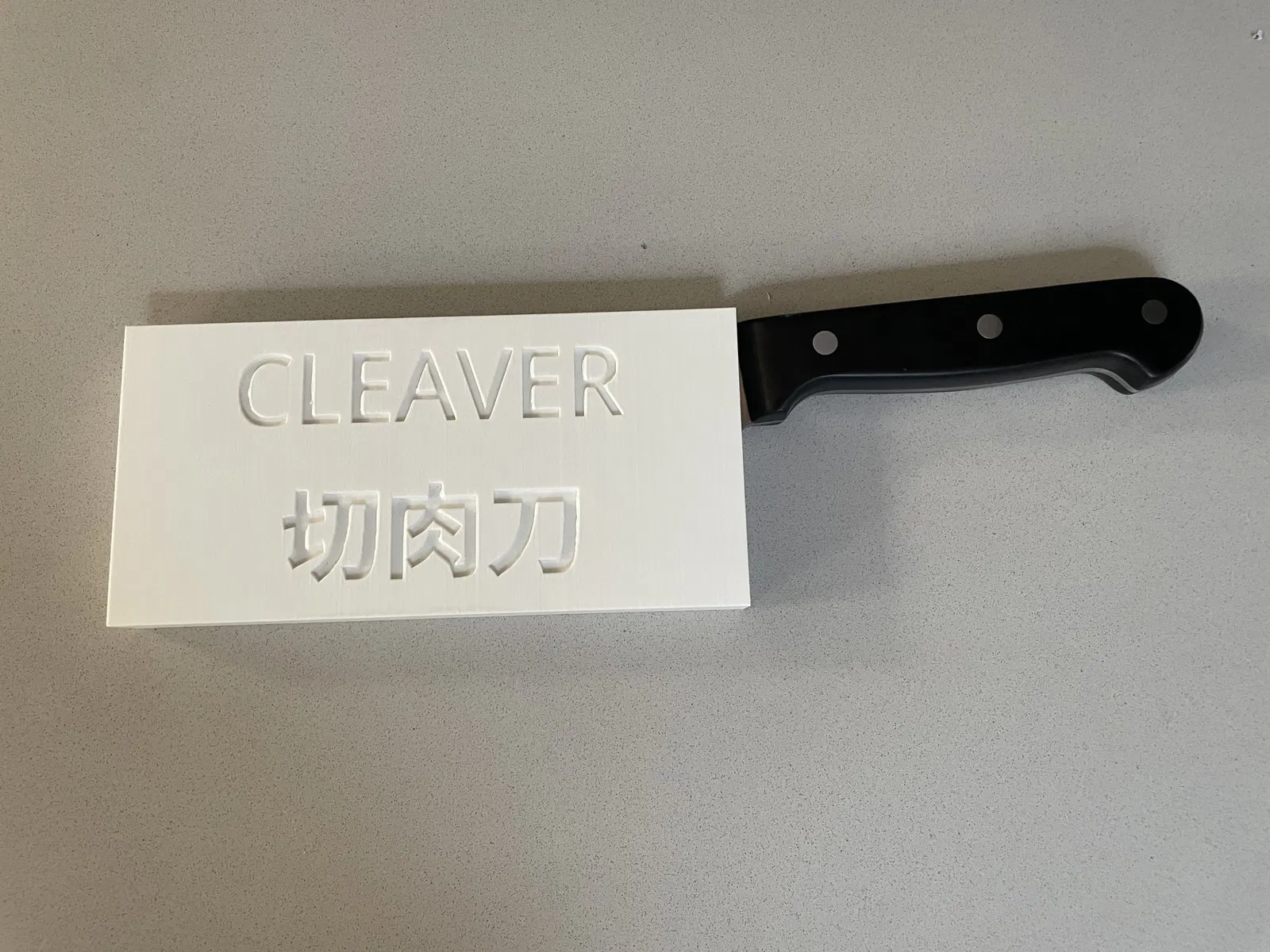 Tôi không thể đảm bảo rằng điều này sẽ hoạt động cho con dao chặt của bạn vì tất cả các con dao chặt có kích thước hơi khác nhau, nhưng để so sánh, lưỡi dao trên con dao chặt của chúng tôi cao khoảng 3 1/16" (~78mm) và rộng 6 9/16" (~167mm). Mở của mô hình chỉ lớn hơn một chút vài mm ở mỗi hướng.