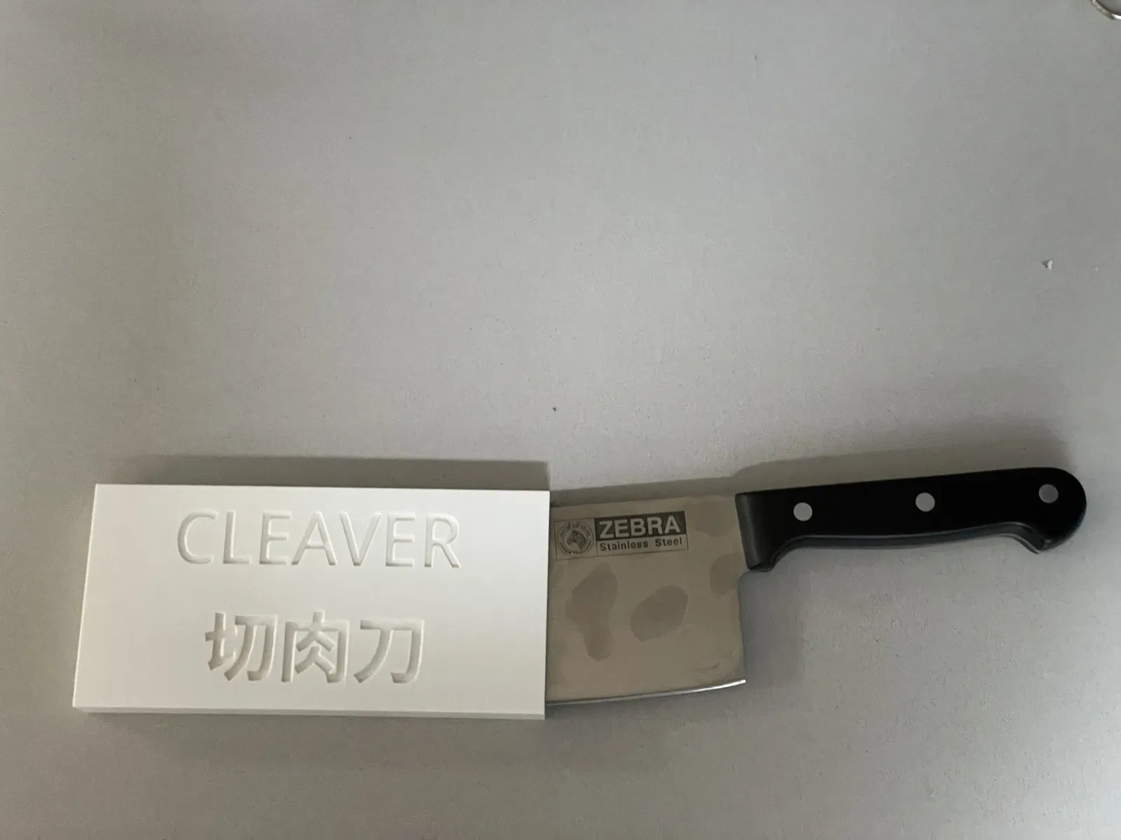 Chúng tôi có một con dao chặt Trung Quốc (切肉刀) nhưng nó quá lớn để vừa vào khối dao của chúng tôi với những con dao còn lại. Vì vậy, chúng tôi để con dao chặt trong một ngăn kéo.