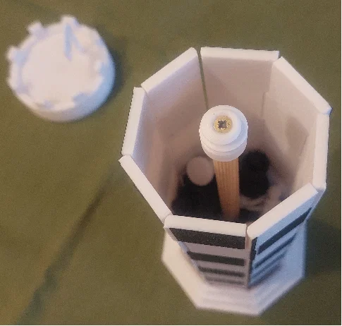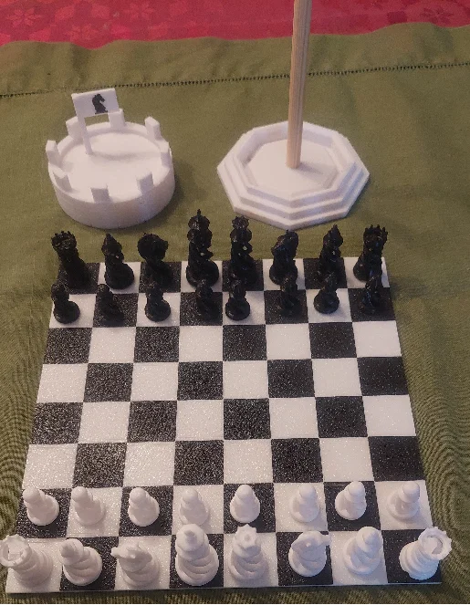 Các quân cờ không bao gồm. Mình khuyên dùng bộ "Spiral Chess Set" rất đẹp của BigBadBison (xem tại đây: https://www.thingiverse.com/thing:470700). Bạn cần scale nhỏ các quân cờ xuống vì bàn cờ này có kích thước thu gọn.