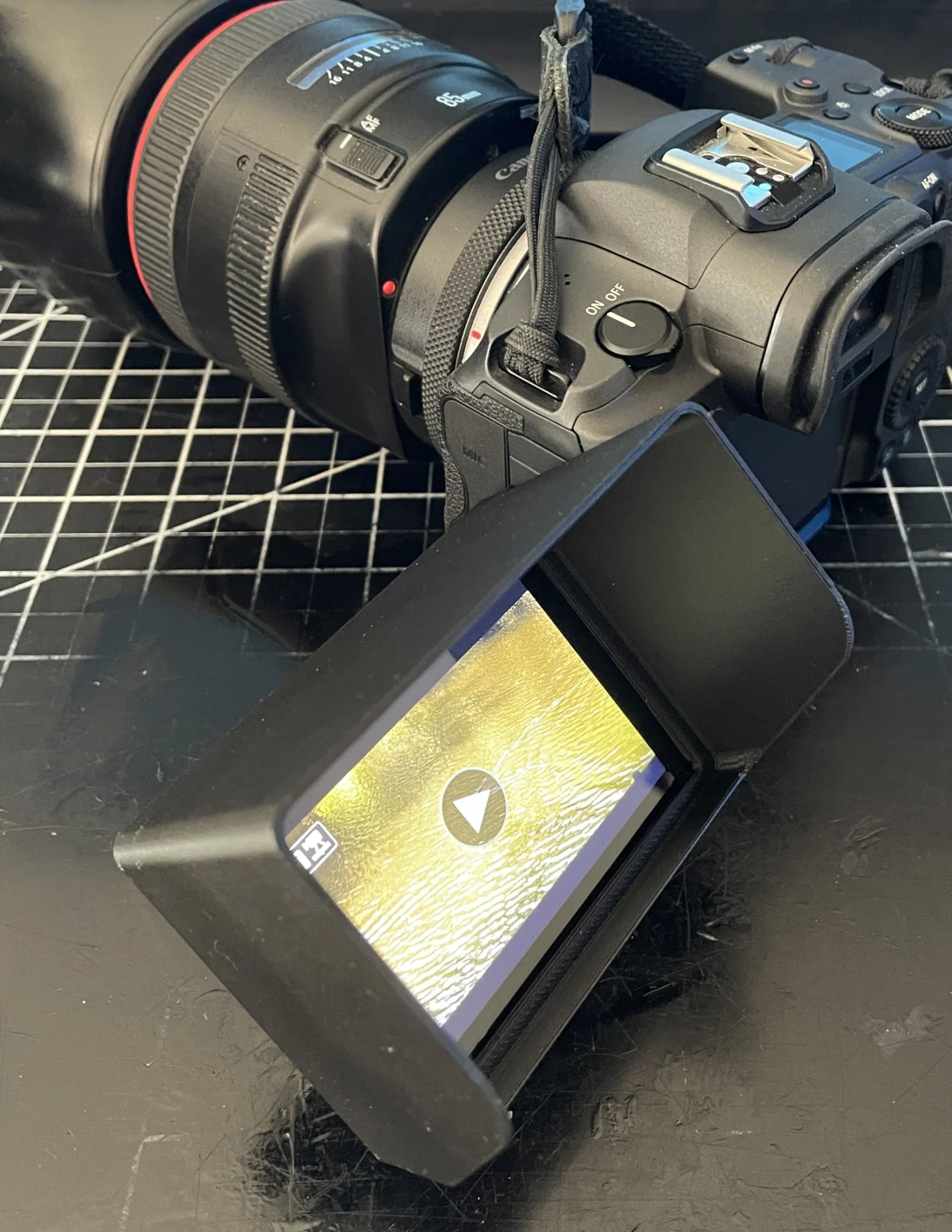 Chỉ là một cái hood che nắng cho màn hình của Canon R5. Có thể cũng vừa với các máy ảnh khác có kích thước màn hình 60x84x7.5mm. Có 2 phiên bản bề ngang 61.4 và 61.6 để bù cho độ co rút filament khác nhau và những máy in chưa được calibrate chuẩn lắm.