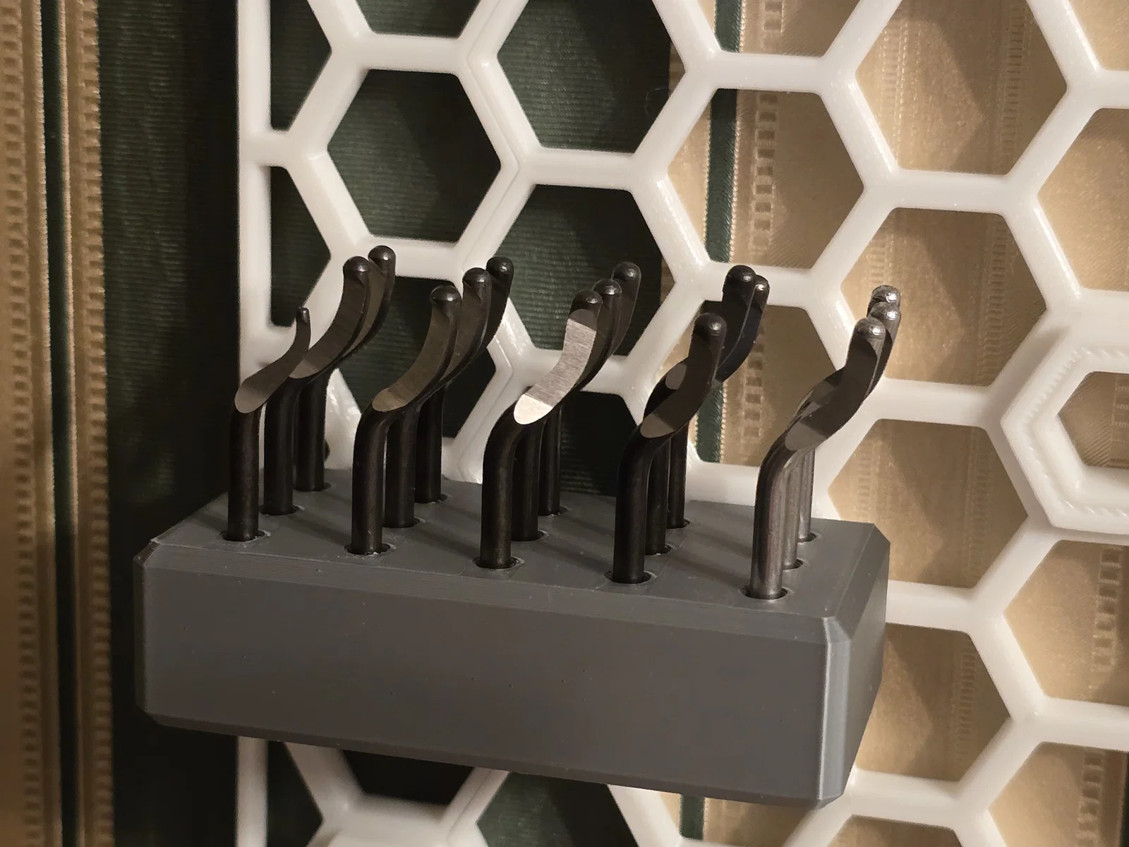 Holder giữ 15 đầu deburring cho Honeycomb Storage Wall (HSW), thiết kế lỗ có đáy đặc nên tips không rơi lọt. Fit trực tiếp không cần mount/cap; tối ưu in PLA để lắp khít với tường in PETG. Không cần support.