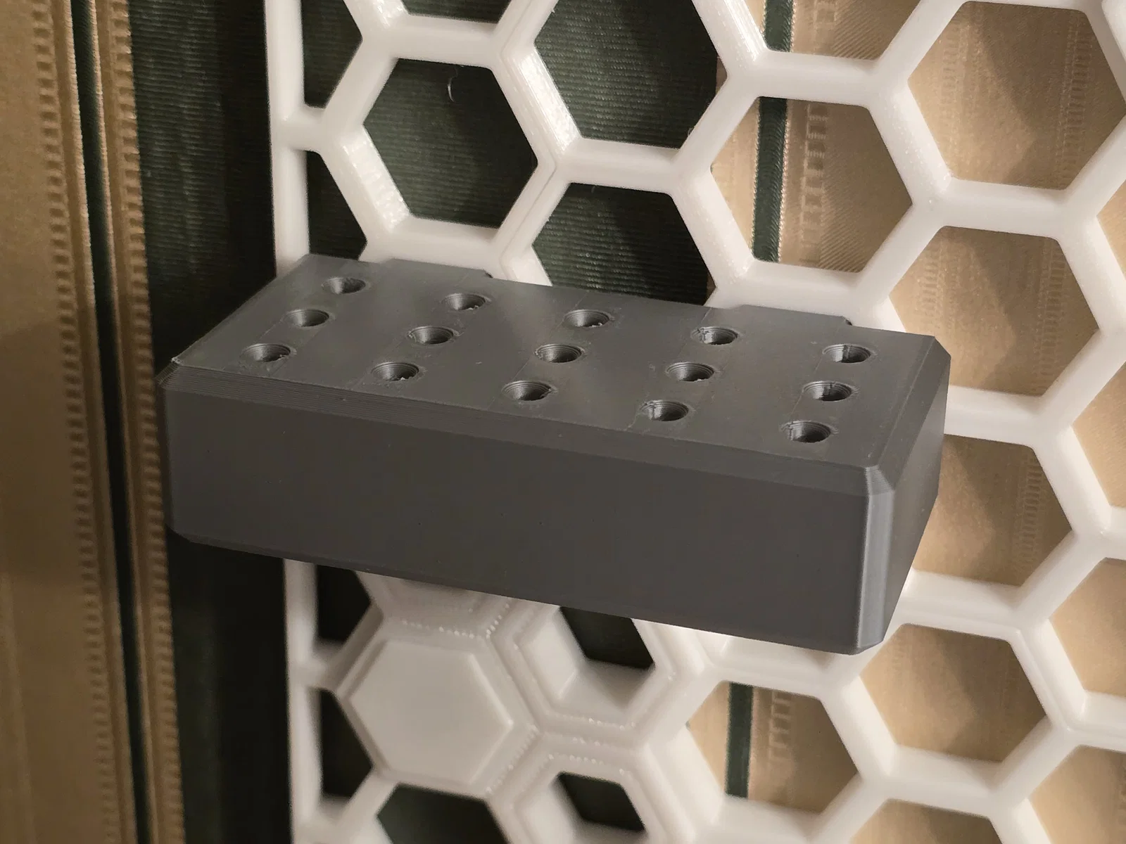 Đây là một cái holder cho 15 đầu (tips) của dụng cụ deburring dùng với Honeycomb Storage Wall. Mình tìm hoài mà không thấy mẫu nào giữ tips ổn, kiểu không bị tuột rơi xuyên xuống. Bản khác duy nhất mình thấy thì lỗ khoan rộng quá nên mọi thứ rớt lọt hết. Nên mình giải quyết bằng cách làm một phiên bản holder custom cho các đầu deburring. Tips sẽ không bao giờ rơi lọt xuống vì phần đáy lỗ kết thúc bằng một lớp đặc.