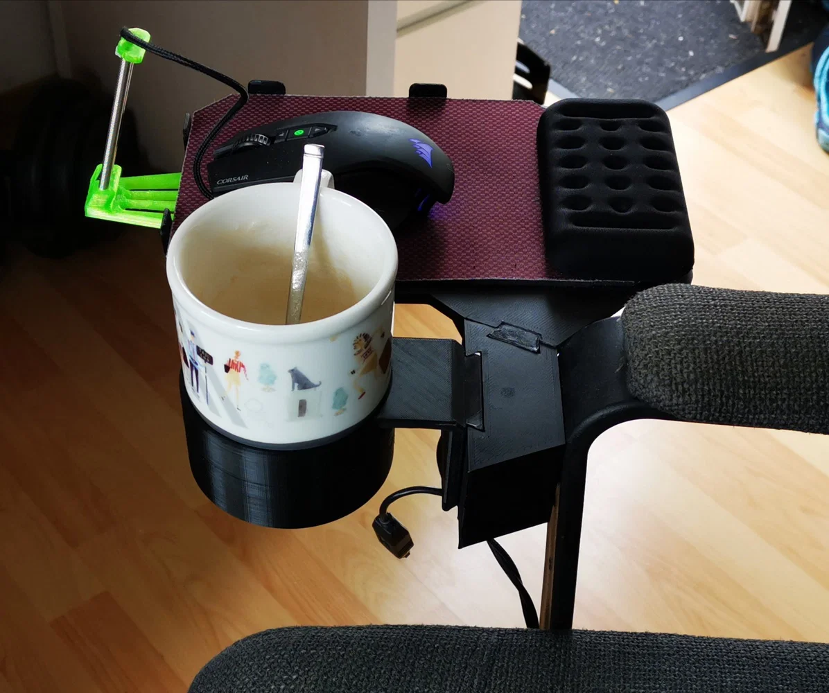 - mỗi bên ghế mình còn gắn một USB hub 4 port. Hub bên trái cắm vào hub 4 port bên phải, và như vậy mình có một sợi cáp USB dài 1m đi kèm. Hub bên phải thì cắm vào một sợi cáp USB male to female dài 2m, vì mình không tìm được hub nào có sẵn cáp USB dài 2m. Nghĩa là cuối cùng chỉ có 1 sợi cáp đi từ ghế lên PC.