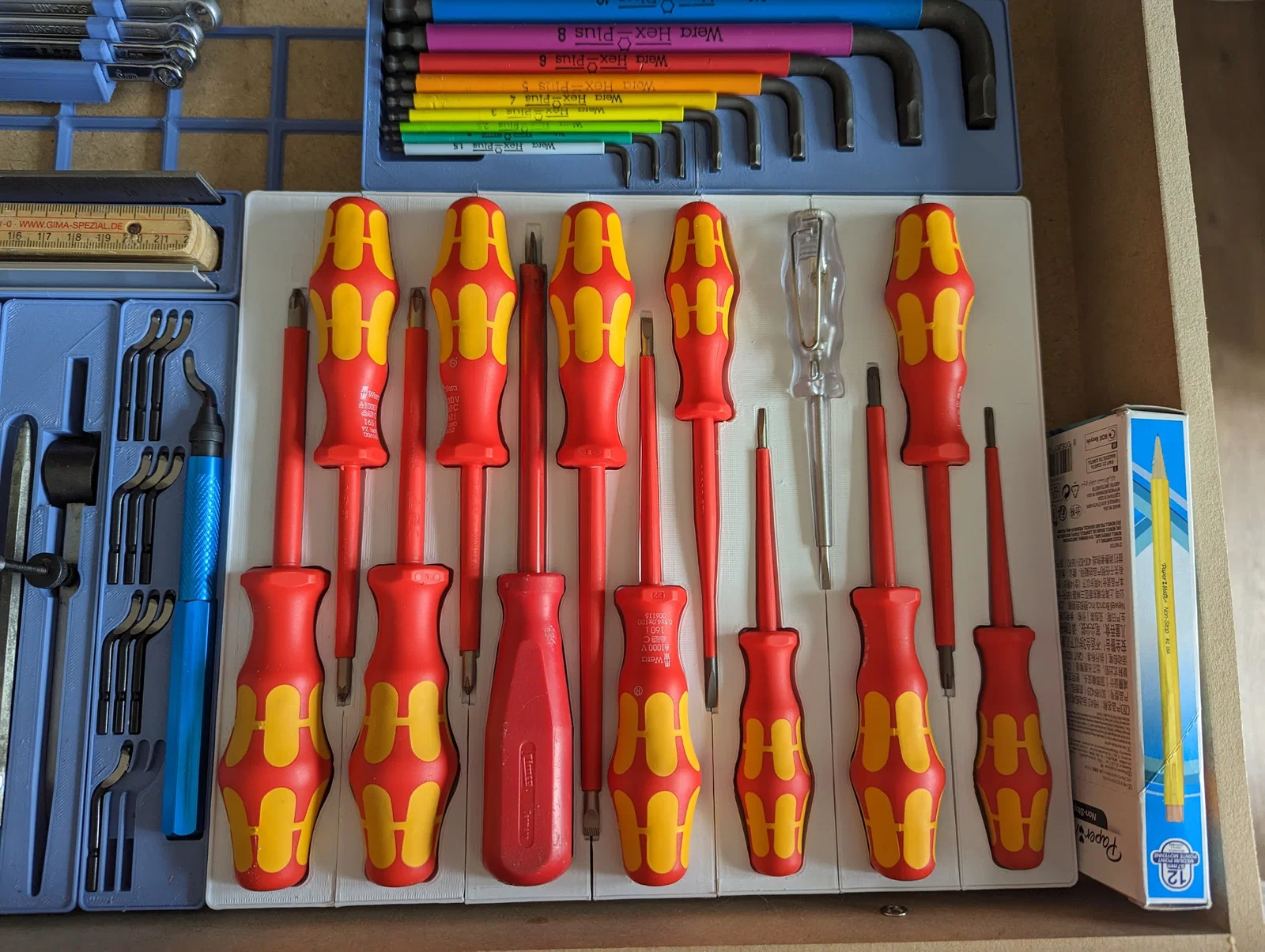 Đây là các holder Gridfinity cho tua vít Wera, được làm dạng module để bạn có thể in trên máy nhỏ hơn (230x230) bằng cách đặt module chéo trên bàn in. Bạn cũng có thể chọn in một vài module tùy theo bộ tua vít bạn đang có.