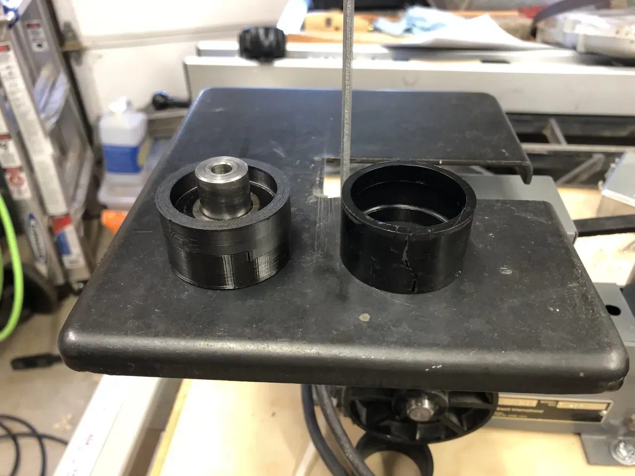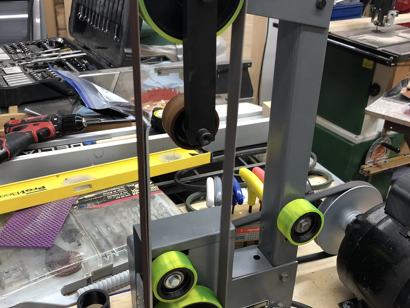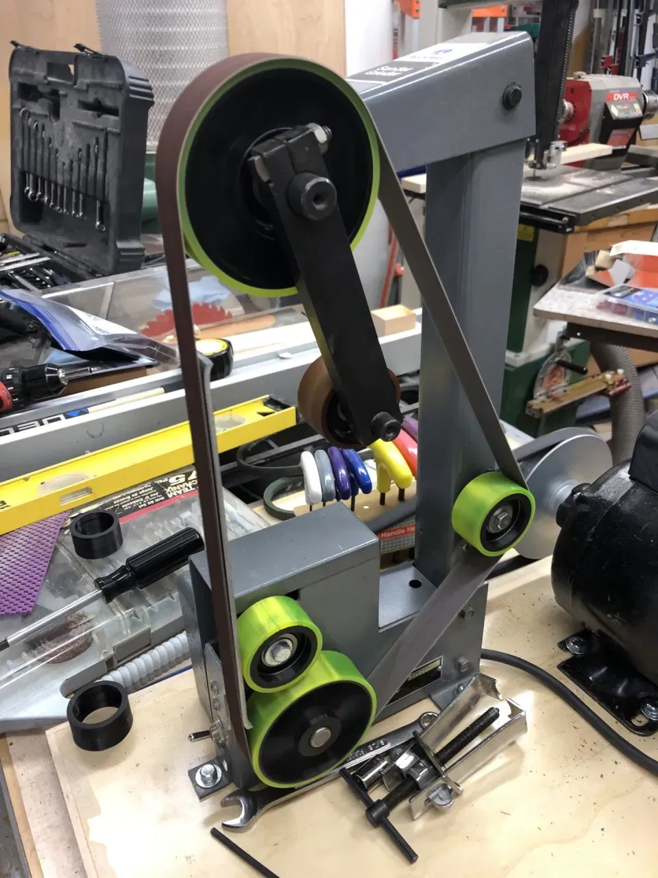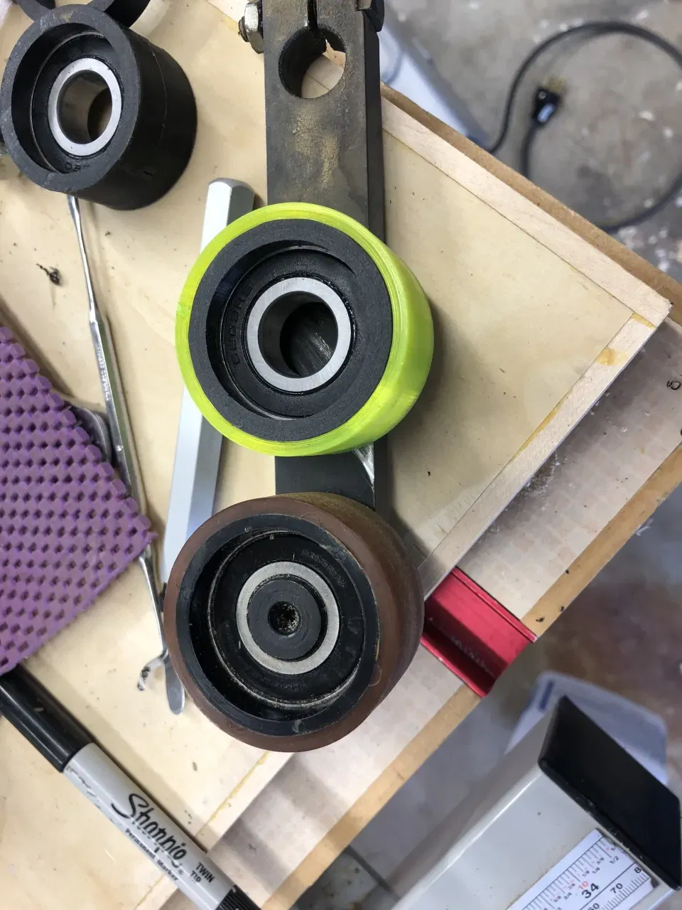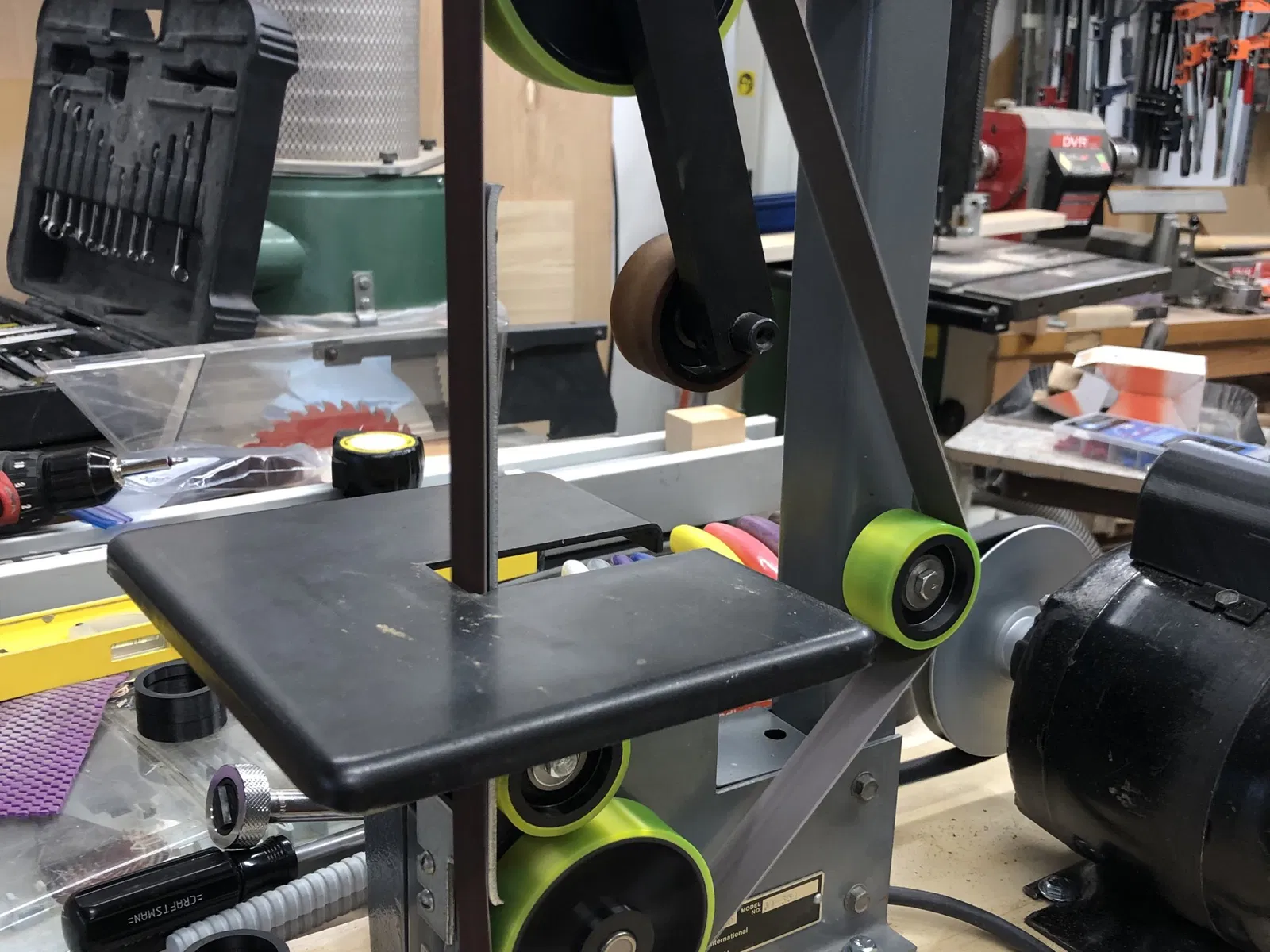 Tôi đã mua một máy chà nhám/mài Rockwell 31-351 1x42 với giá rẻ. Sau khi mua, tôi phát hiện ra rằng một số bánh xe bị hỏng, thiếu lốp hoặc hoàn toàn mất tích. Các bộ phận này hiện chỉ có sẵn qua ebay nên tôi đã quyết định tự làm các bộ phận thay thế. Rockwell 31-351 dường như sử dụng các kích thước bánh xe giống như 31-350 phổ biến hơn và 31-352 ít phổ biến hơn, vì vậy chúng có thể hoạt động trên những máy đó.