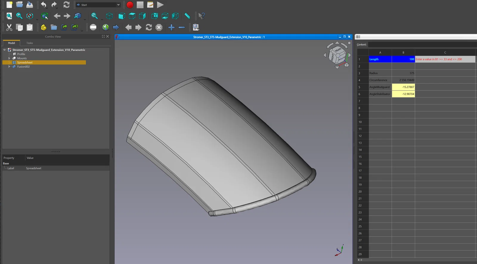 Mẫu V10 có thể kéo dài chắn bùn thêm 30 cm, gồm 10 cm ở phía trên và 20 cm ở phía dưới. Nhưng bạn có thể tự đặt chiều dài! Model này là parametric, chỉ cần nhập chiều dài của bạn trong bảng tính (spreadsheet) của FreeCAD, export rồi in thôi!