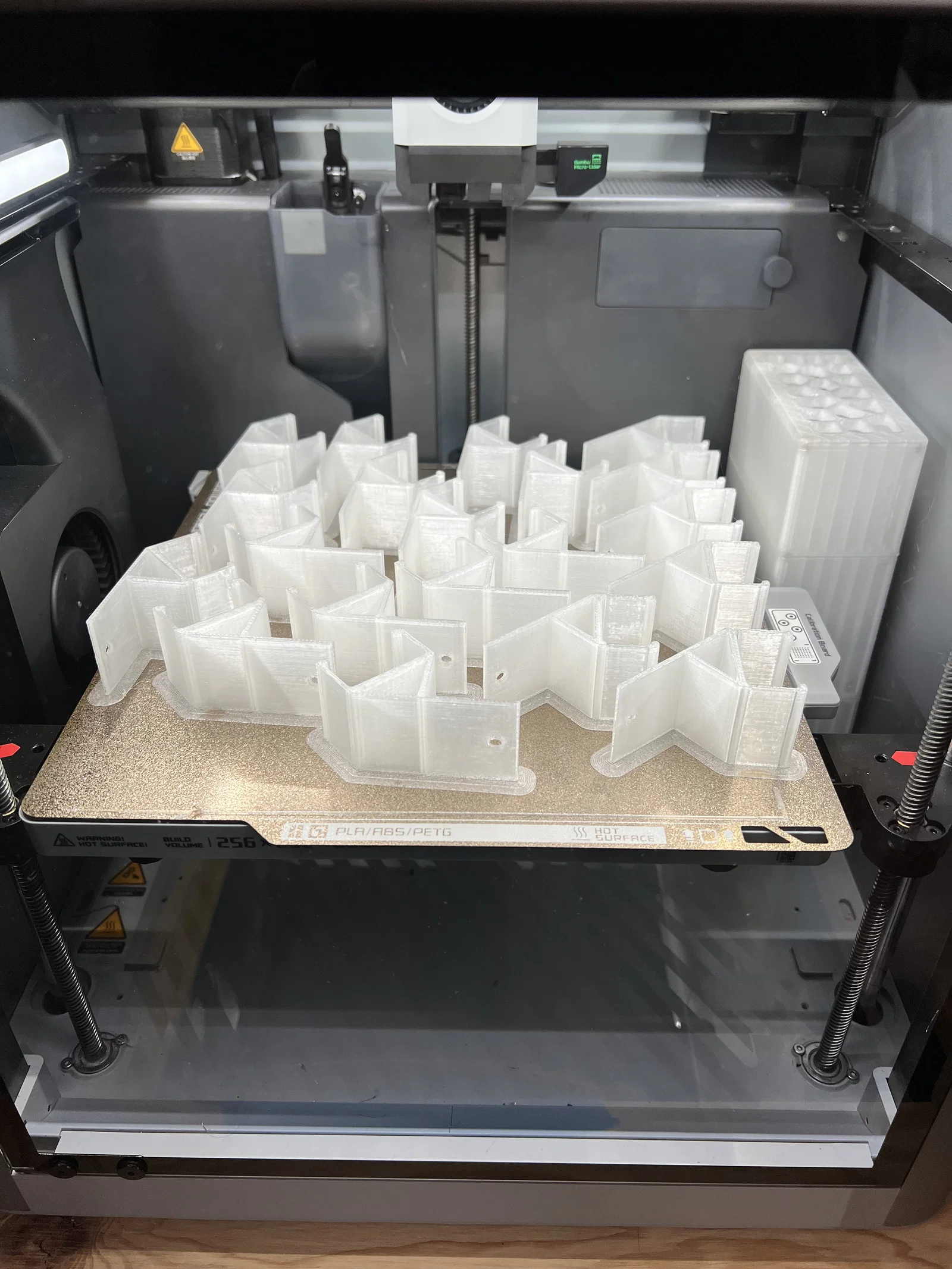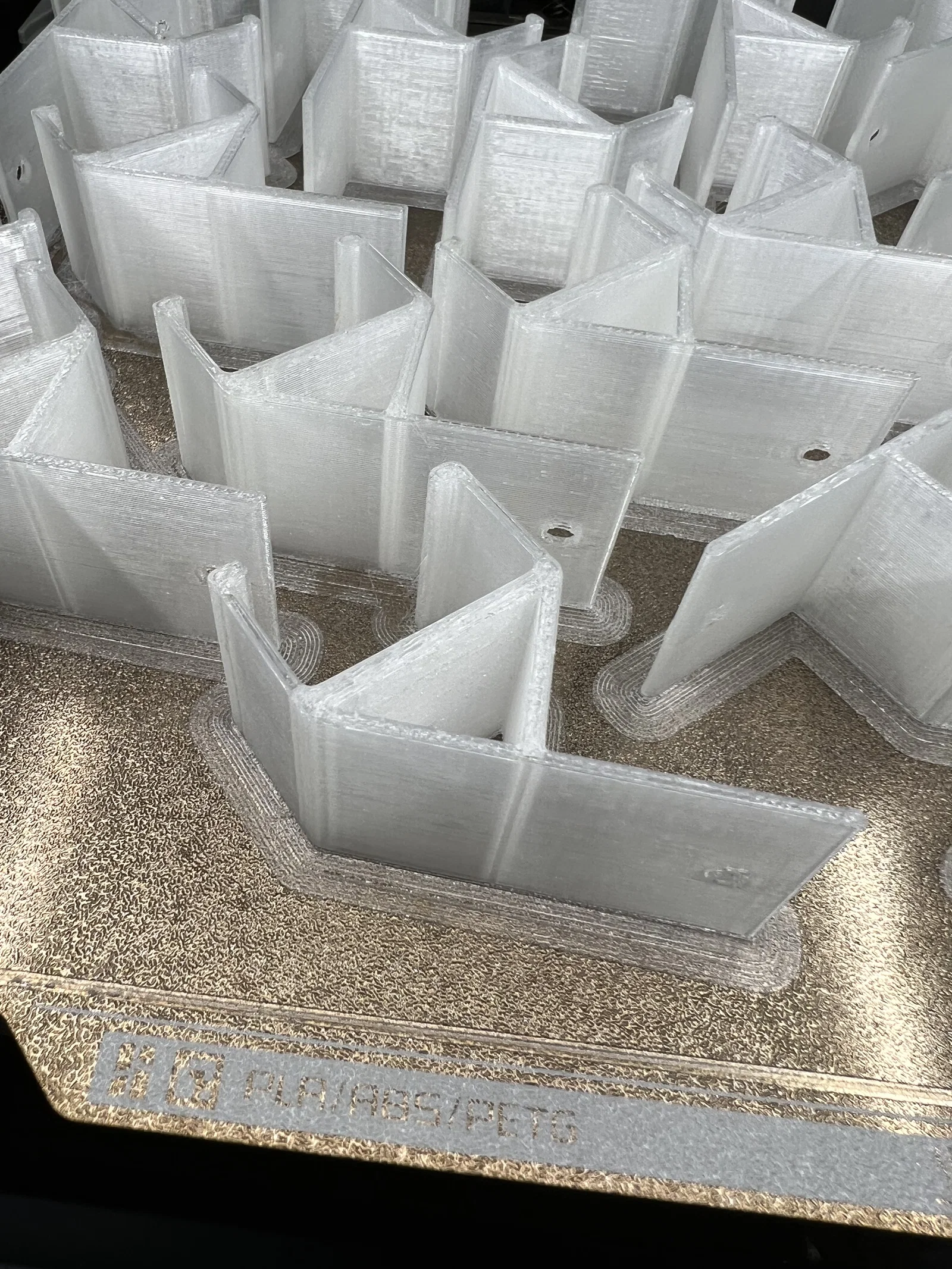 Mấy cái này mình in bằng White Transparent ABS của Hatchbox. Mình có thể in 20 cái một lần trên Bambu X1C và thiết kế để in nằm nghiêng (in on their side) không cần supports, nhưng thêm brims thì sẽ dễ dính bàn hơn. Rất khuyên dùng filament White Transparent ABS Hatchbox hoặc PETG trong suốt vì ngàm sẽ phát sáng theo đèn, tạo thêm một hiệu ứng phụ.