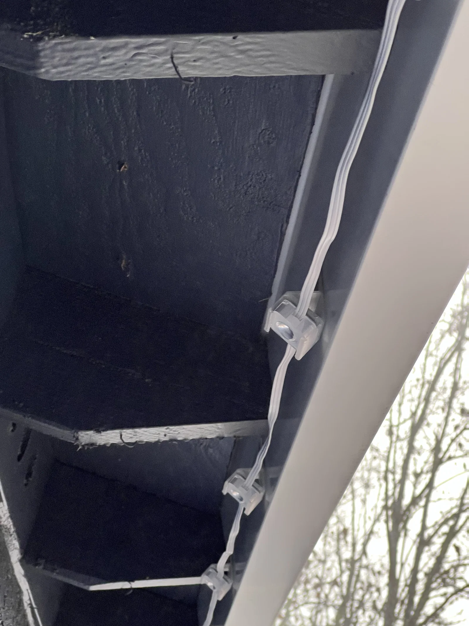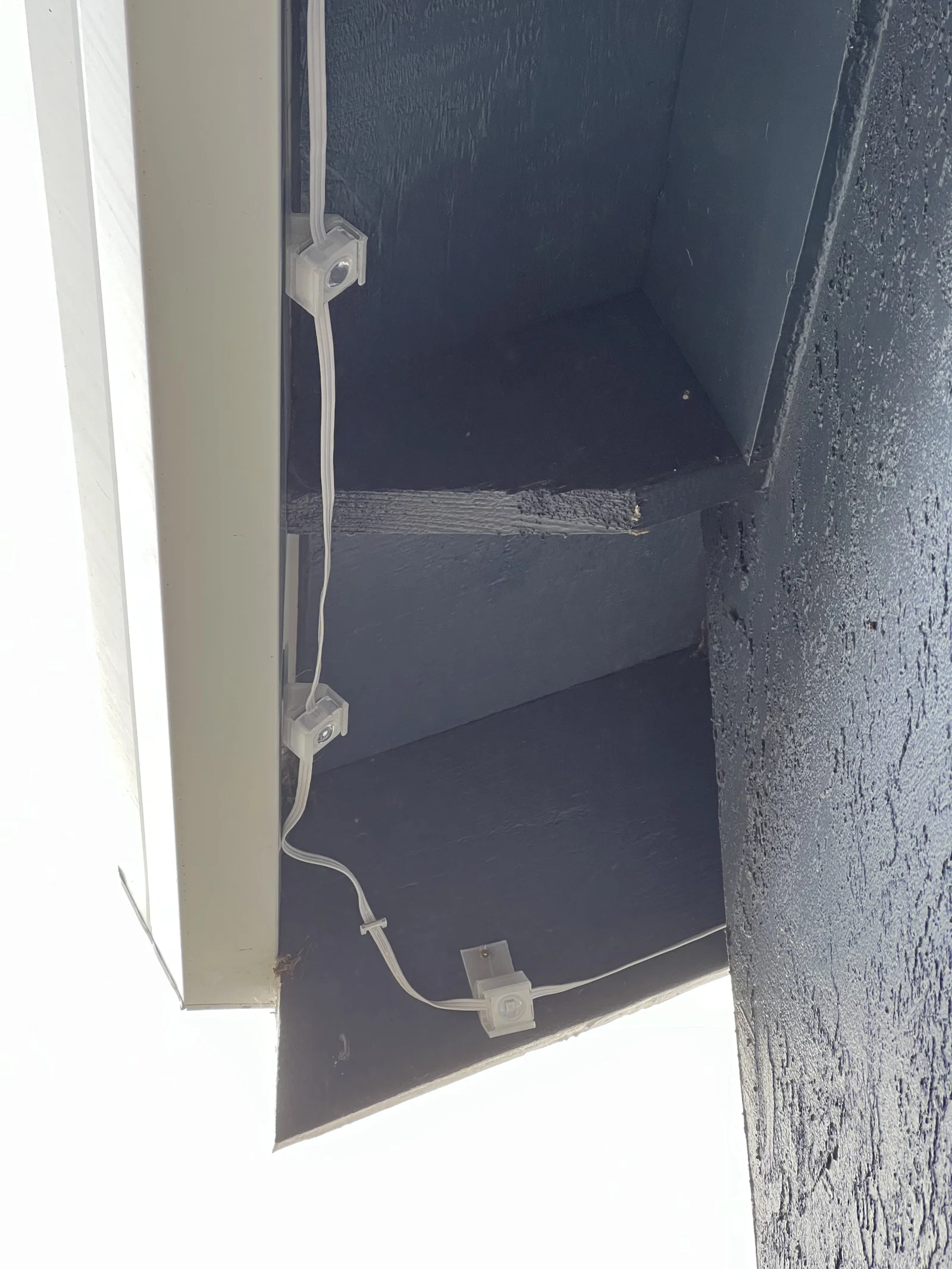 Mình thấy có vài thiết kế gắn mấy đèn này rất đẹp, nhưng chúng quá cầu kỳ, không phù hợp để in tới 120 cái để lắp đèn. Mình làm mẫu này để gắn đèn ở góc 45 độ và có thể tùy biến: hoặc dán VHB để gắn lên máng xối, hoặc dùng đinh/vít để bắt lên phần mái hiên (eaves).
