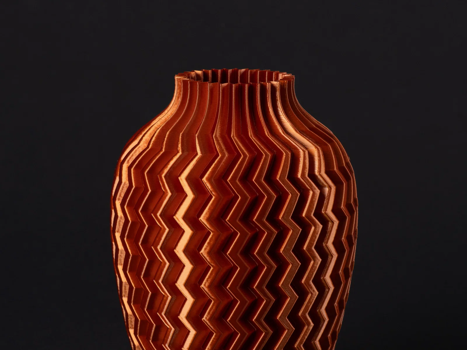 Bình hoa hình học với họa tiết zigzag nổi bật, tạo hiệu ứng thị giác cuốn mắt trên toàn bề mặt. Thiết kế tối ưu cho vase mode (FDM/FFF), file STL, dễ in, hợp decor phong cách hiện đại hoặc industrial.