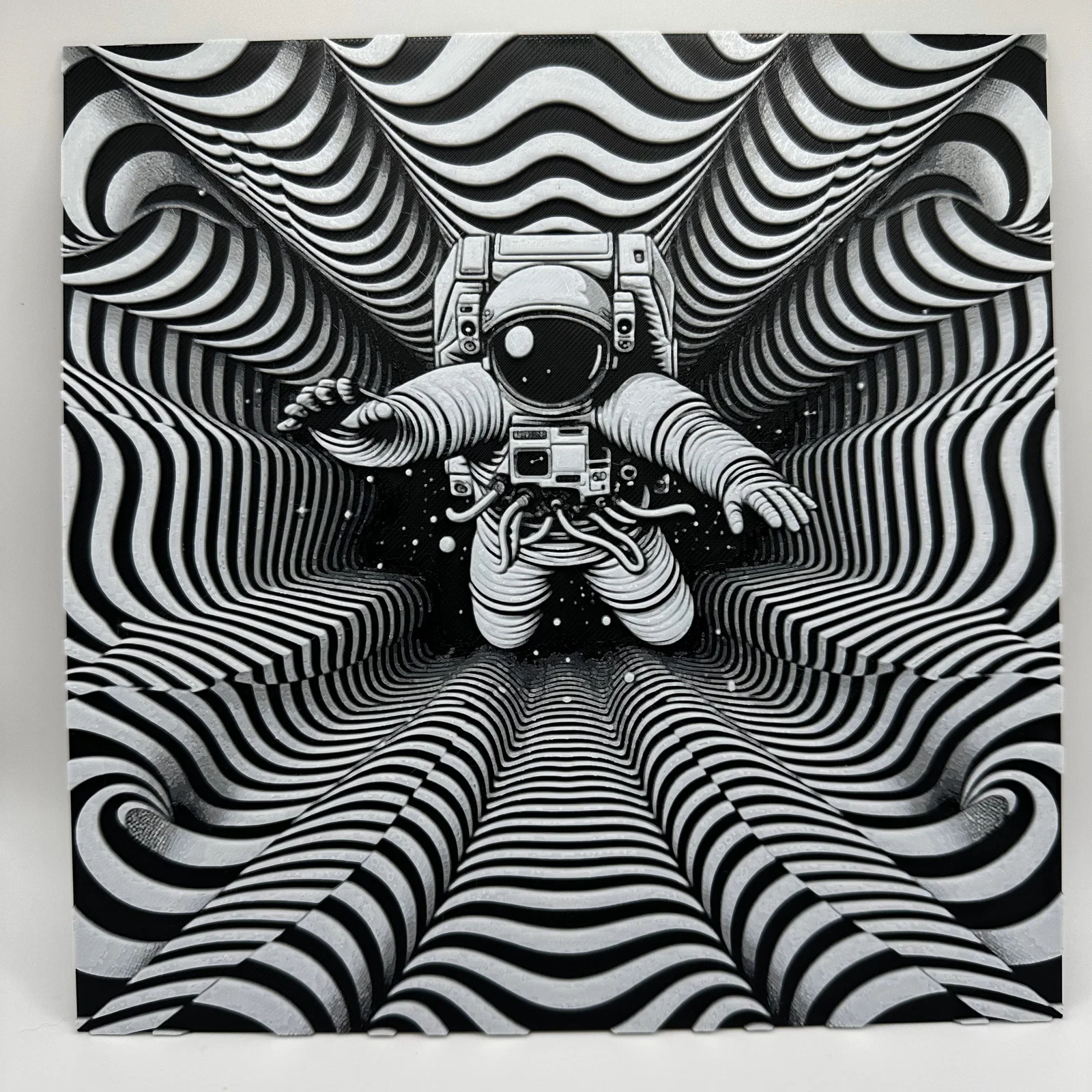 Mẫu HueForge wall art “Intergalactic Travel”. Hướng dẫn in 100% infill, layer 0.08mm (base 0.16mm) và lịch swap filament PLA+ Sunlu Black/Grey/Silver/White theo từng layer để ra đúng hiệu ứng.