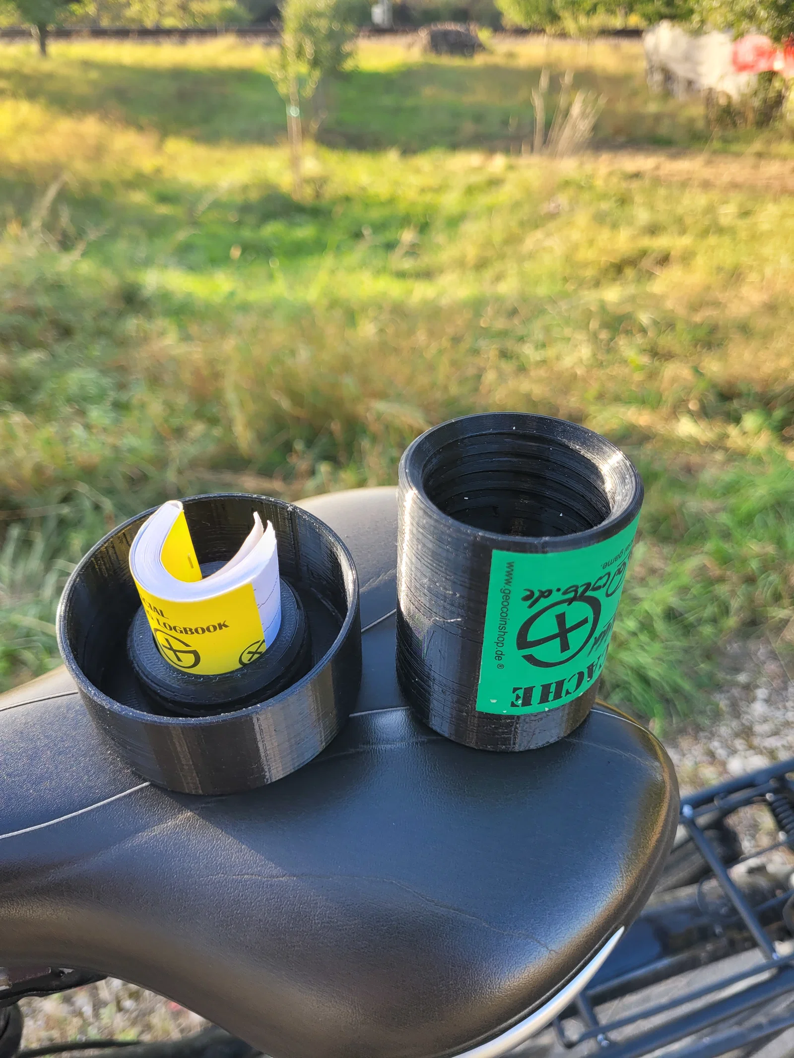 Hộp Geocaching cho ống 60mm, khoang trong đường kính 40mm dài 60mm, đủ chỗ cho logbook và TB hoặc coin. Ren vặn nhẹ nhưng chắc, đã thử ngoài trời vài tháng vẫn kín, không nước hay đọng hơi.