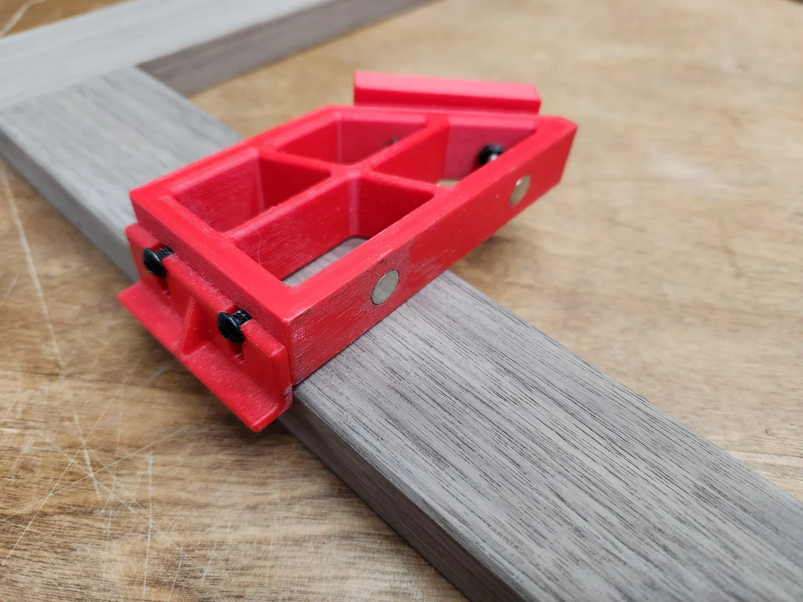 Đây là một đồ gá miter / crosscut đơn giản cho hobby saw, dùng 2 viên nam châm 8mm x 2mm để giữ lưỡi cưa luôn thẳng hàng. Bạn cần in 1 cái guide và 2 cái fence để hoàn thiện dụng cụ. Hai fence được bắt bằng vít M3x12mm đầu button (button head) kèm ê-cu lục giác ở mặt sau. Fence có thể chỉnh lên xuống để phù hợp với vật liệu mỏng hơn.